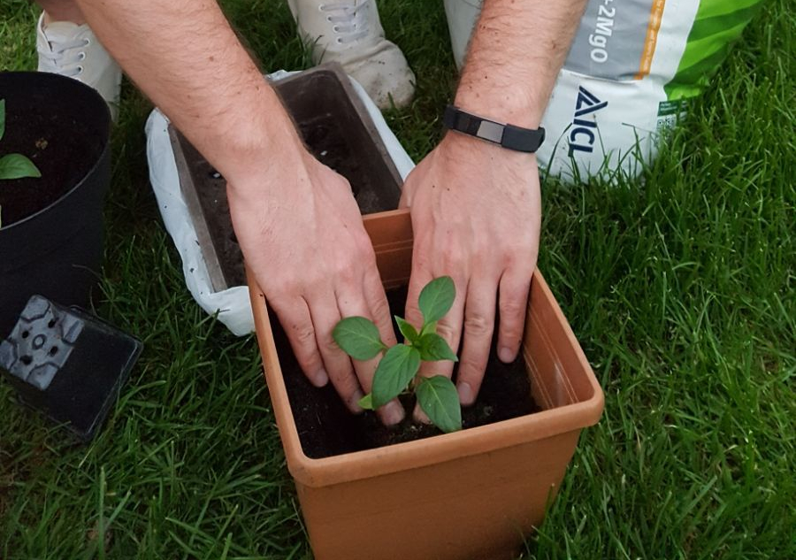Step 6. Fill the pot up with some more compost, enough to ensure that the stem of the pepper is not too exposed, as this won’t be helpful to its growth once it starts to be left outdoors as it could be blown over in the wind. Instead, we want a strong, sturdy plant to give it the best chance. Don’t worry if this means some of the lower leaves are submerged.
