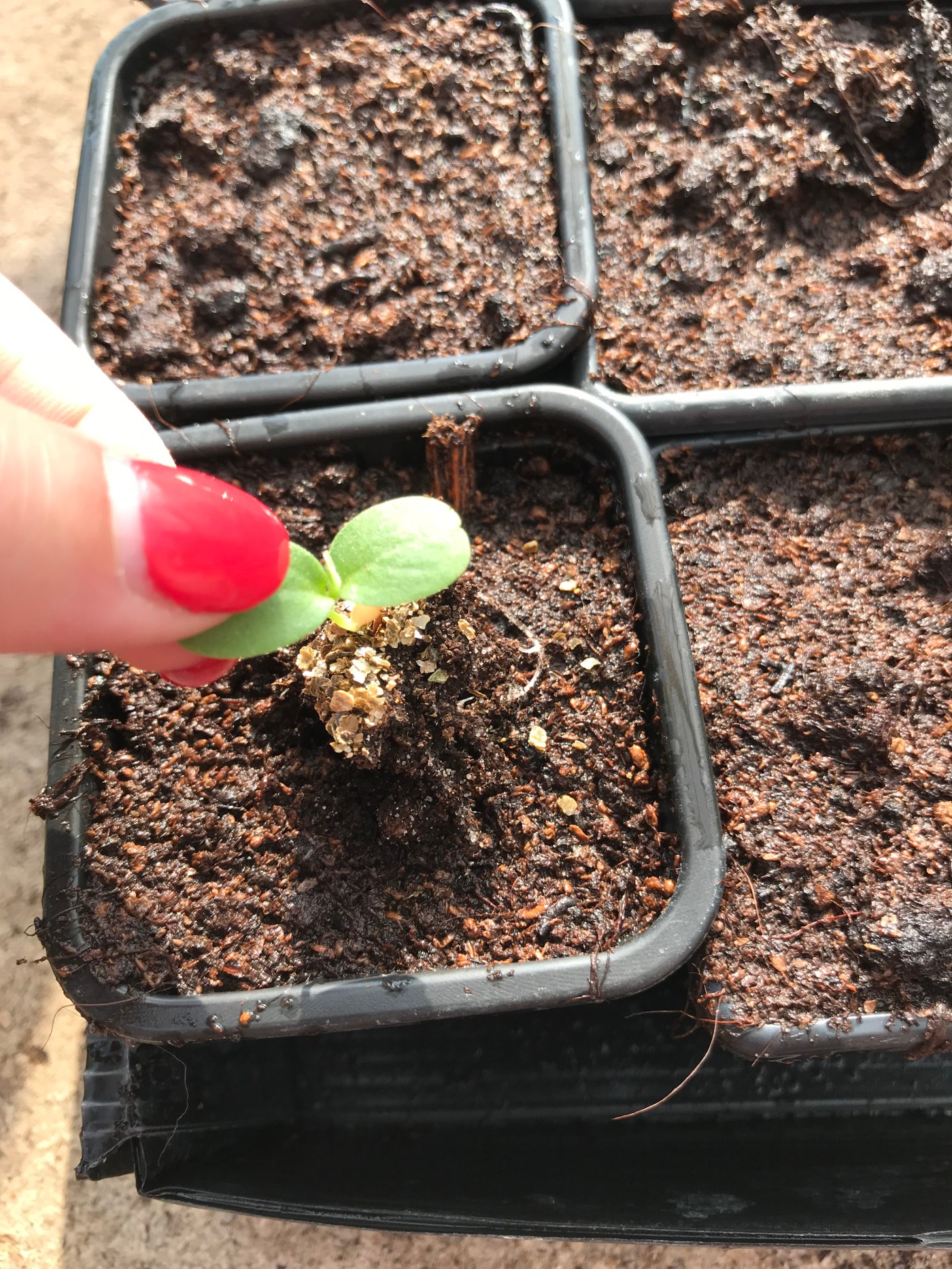 Last weekend, they were ready to prick out. We filled 3″ pots with multipurpose compost and watered them well to moisten the compost.
