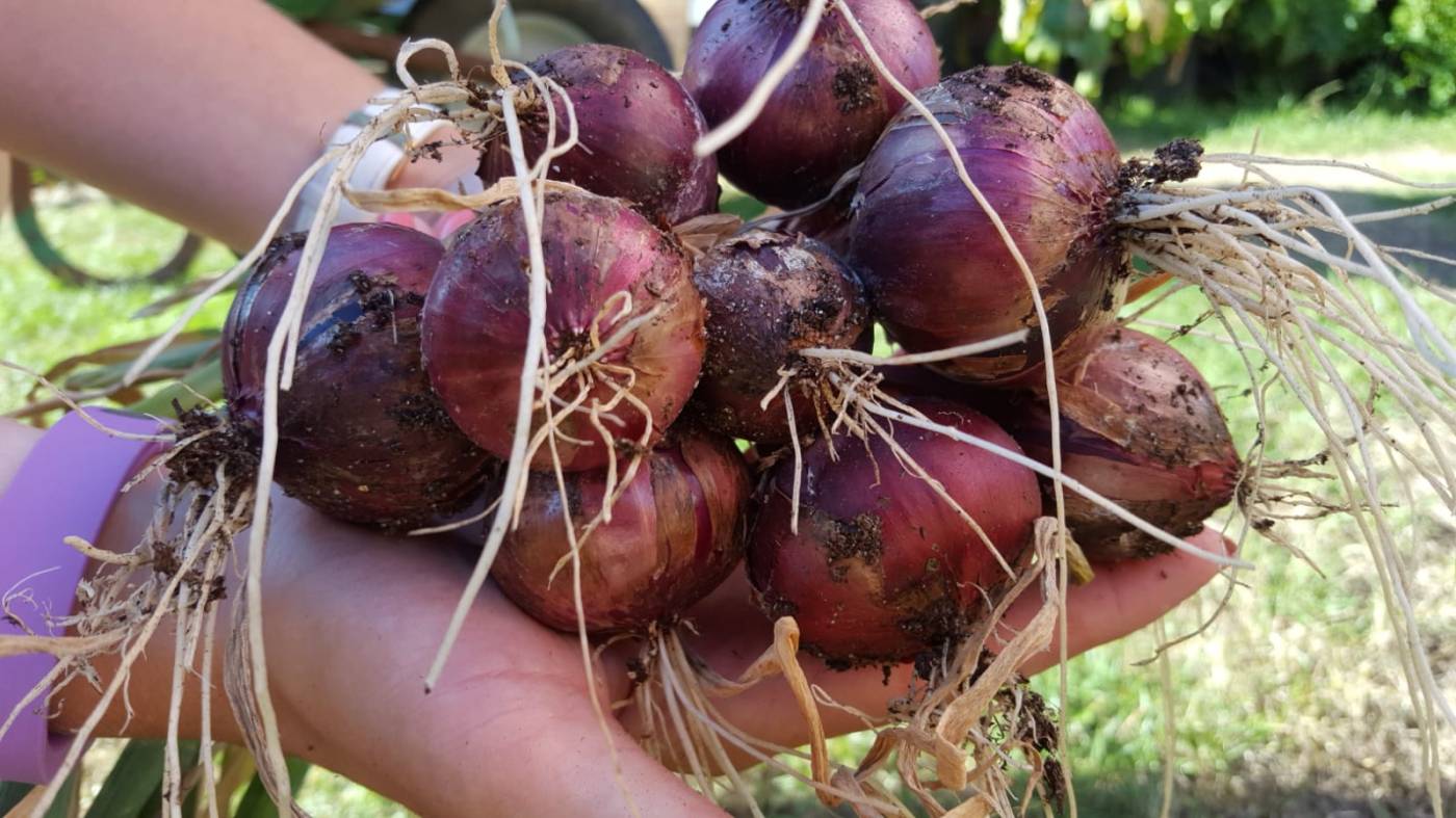 It was time to harvest the red onions we had been growing in a pot last week. Although they hadn’t grown particularly big, their leaves had fallen to one side and they were no longer putting up new centre leaf growth so they were as big as they were going to get!