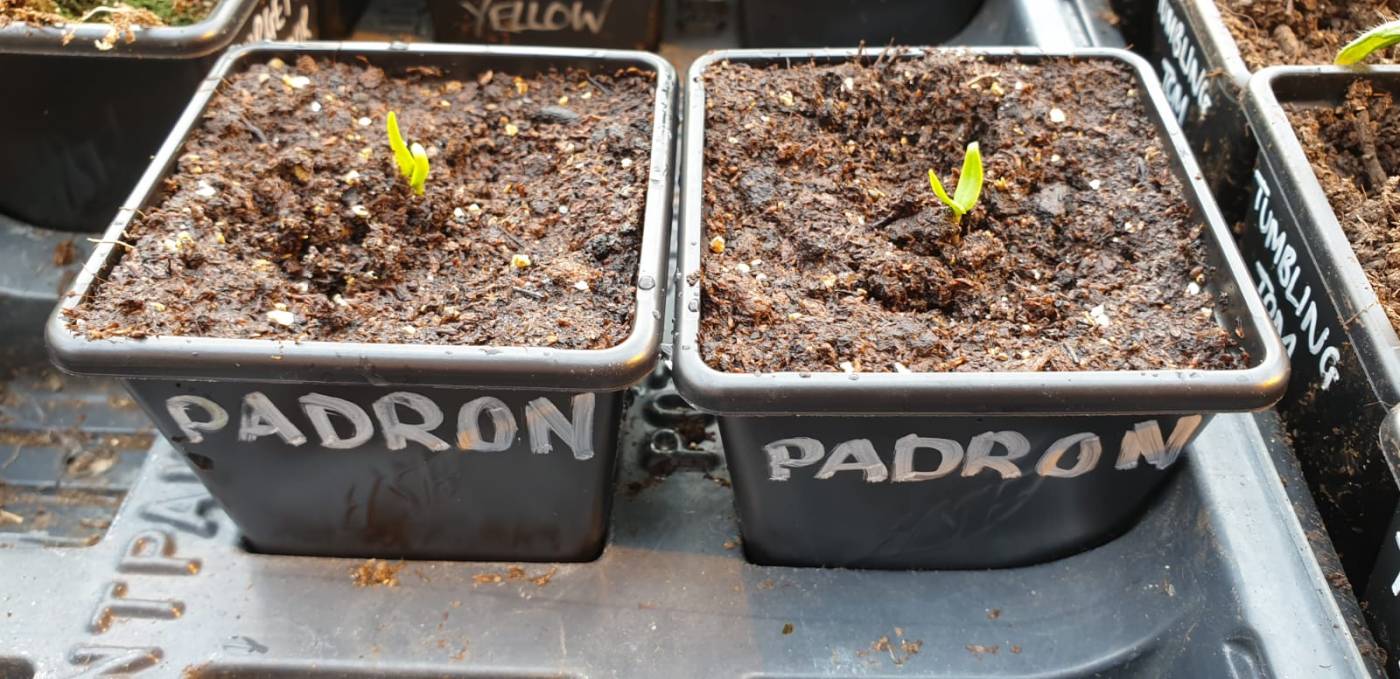 Like with most of the seeds we sow, they were sown in slightly moistened and gently compressed Seed and Modular compost and then covered with vermiculite. The peppers need a bit of heat to germinate, so they were popped on the propagator until they started poking their heads out.