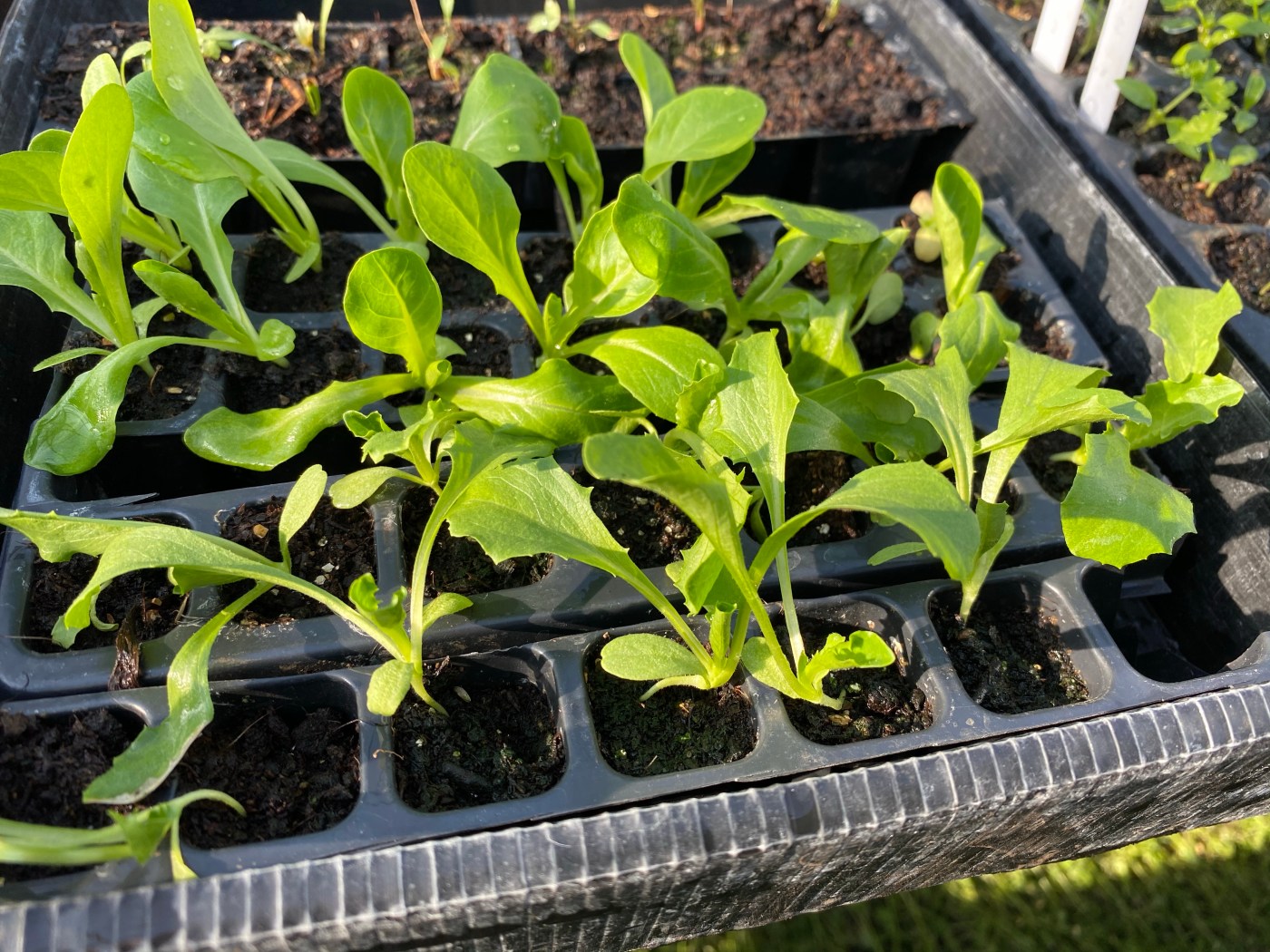 This is the sort of size plant we’re looking for before planting out. You can see both some Little Gem and Iceberg lettuces in the photo. However, we have only planted the Little Gem out into a pot this time. We will grow the Iceberg on a little more and then plant these out.
