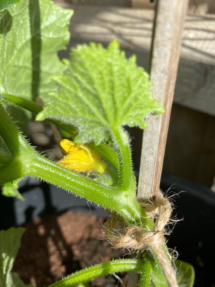 Next up are the male flowers! Although lots of cucumber varieties these days are “female only”, so of the older varieties, and more often the outdoor varieties still grow both male and female flowers. Unlike courgettes and marrows which need both in order to pollinate, cucumbers female flowers self-pollinate. And in fact, if they are pollinated with pollen from a male flower, the cucumber is likely to taste bitter! Therefore, this one here got pinched off along with the side shoots.