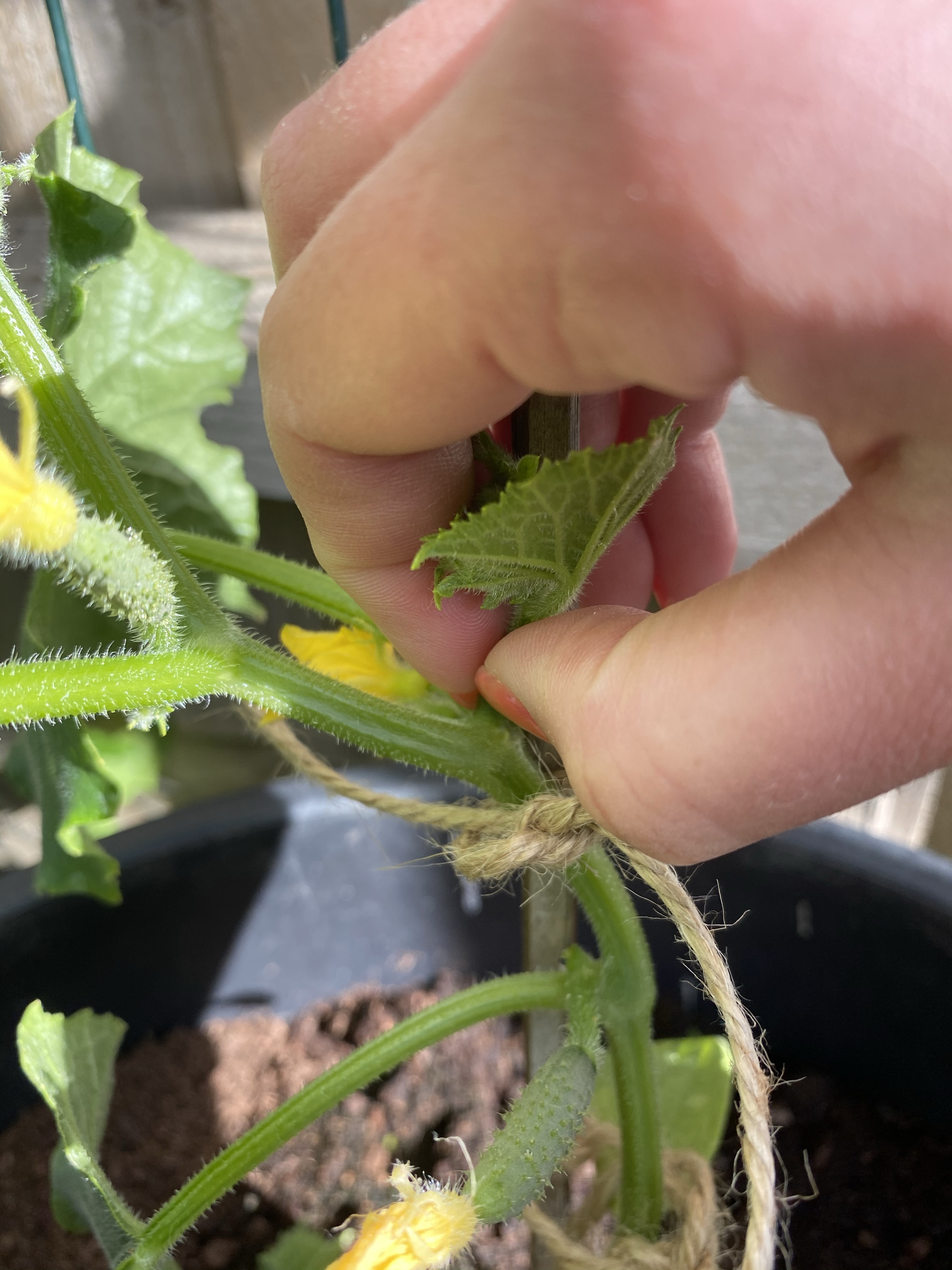 Finally, we tied the cucumbers up. As with the tomatoes, we do this by tying the garden twine first round the cane tightly, and then loosely round the stem of the cucumber. As we’ve said before, we don’t want to strangle the plant as it grows on.