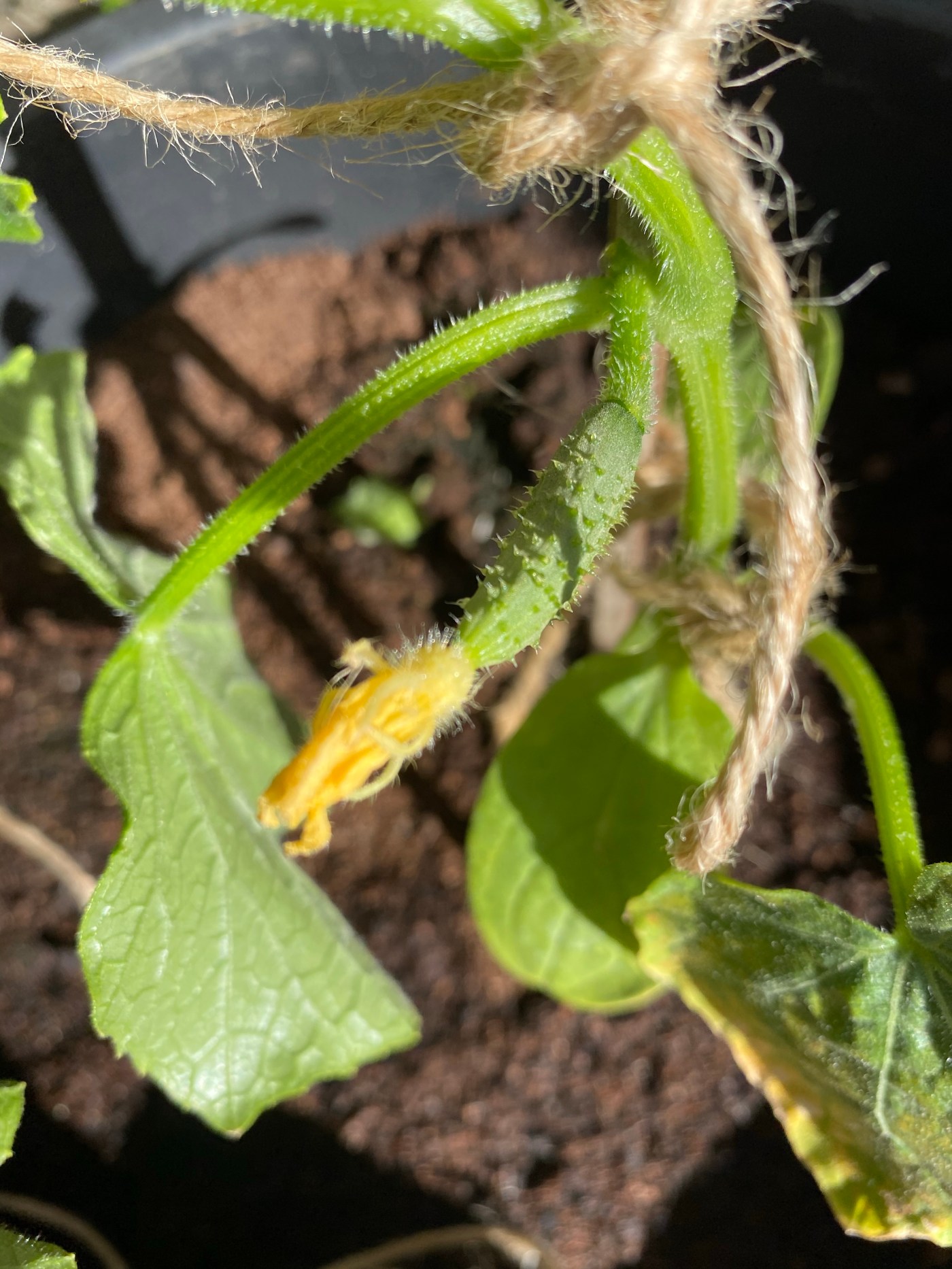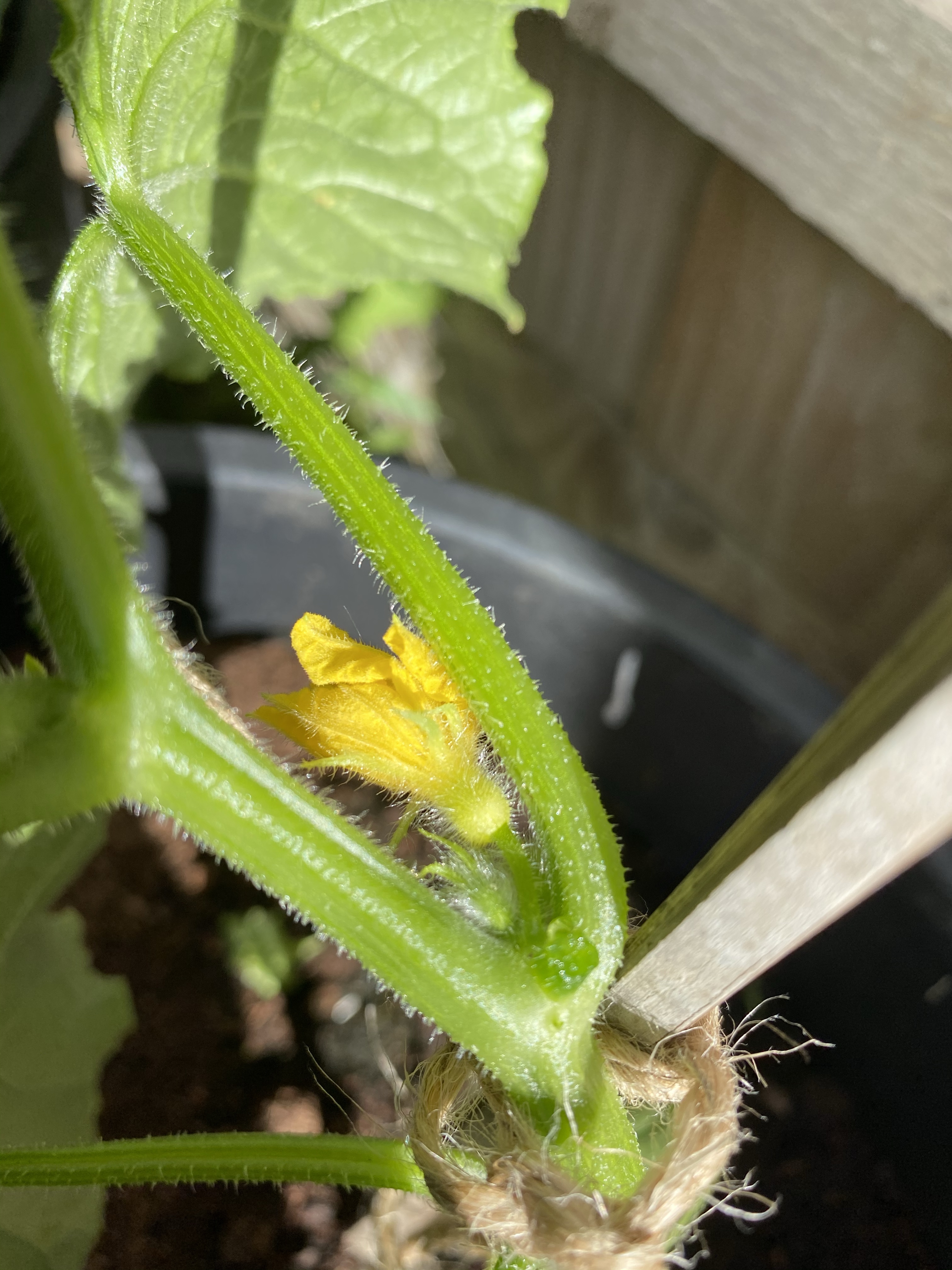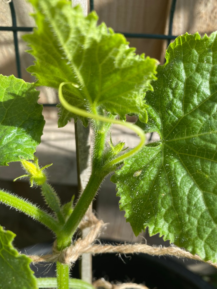 We tied it in a couple of place along its stem to support it up the cane and you can see that the cucumbers are starting to form.