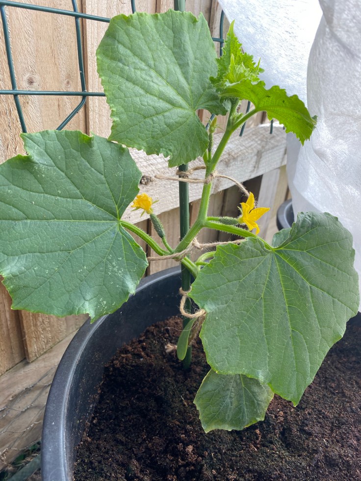 We’re still protecting the cucumbers from the sun using fleece and will keep doing so until they get too big to do it with!