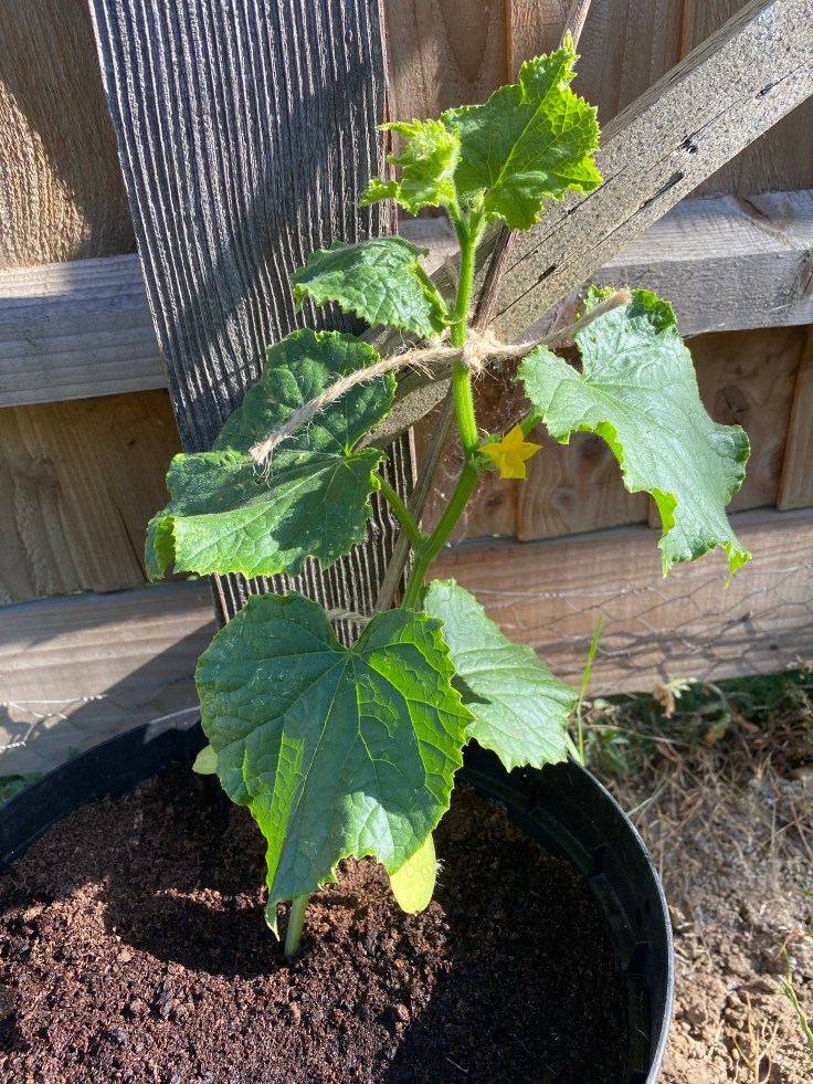 After a few weeks in their final destinations, our outdoor cucumbers needed a bit of tending to at the weekend. This is one of the Marketmore cucumbers which has almost reached the top of its cane and onto its wire mesh.