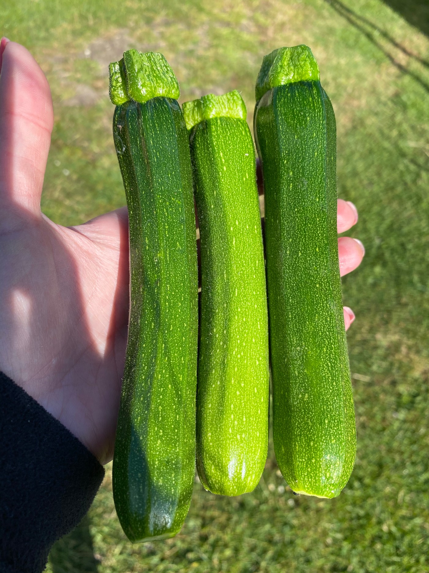 We now have two sowings of container courgettes planted out. The earlier sowing are doing tremendously well now they have got going, producing one courgette per plant every 2 days on average (depending on the weather of course). Here’s one of our recent harvests!