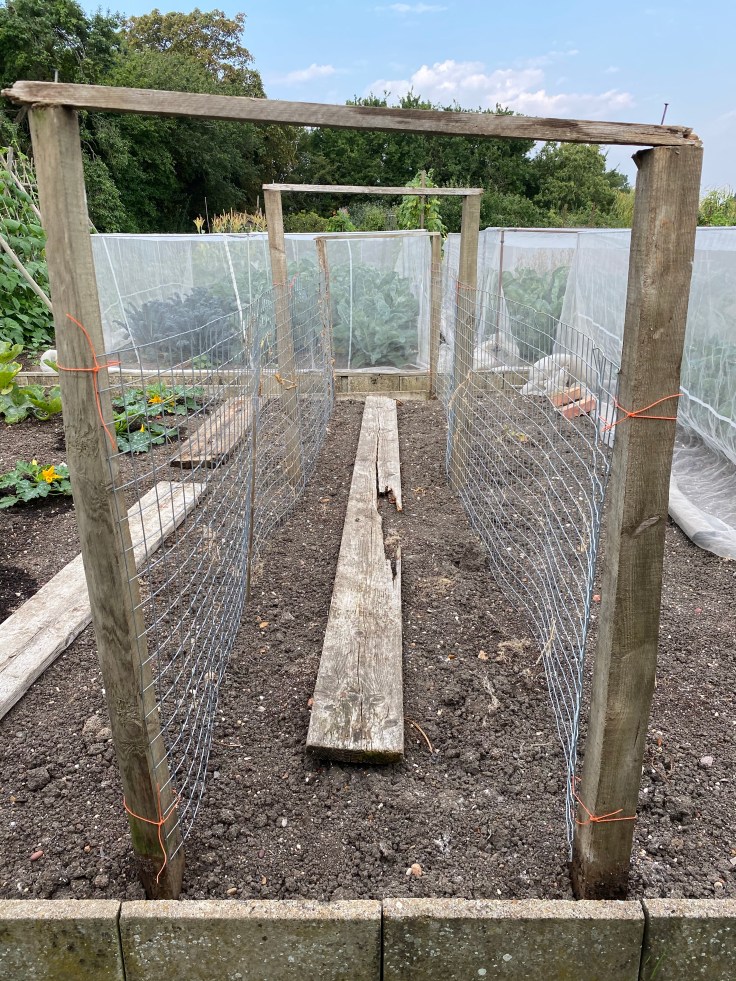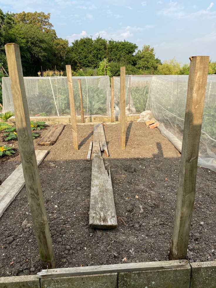 Lastly, we nailed short wooden battens to the top between the posts to support the bird netting that we were going to throw over the top once planted to prevent pigeon attacks!