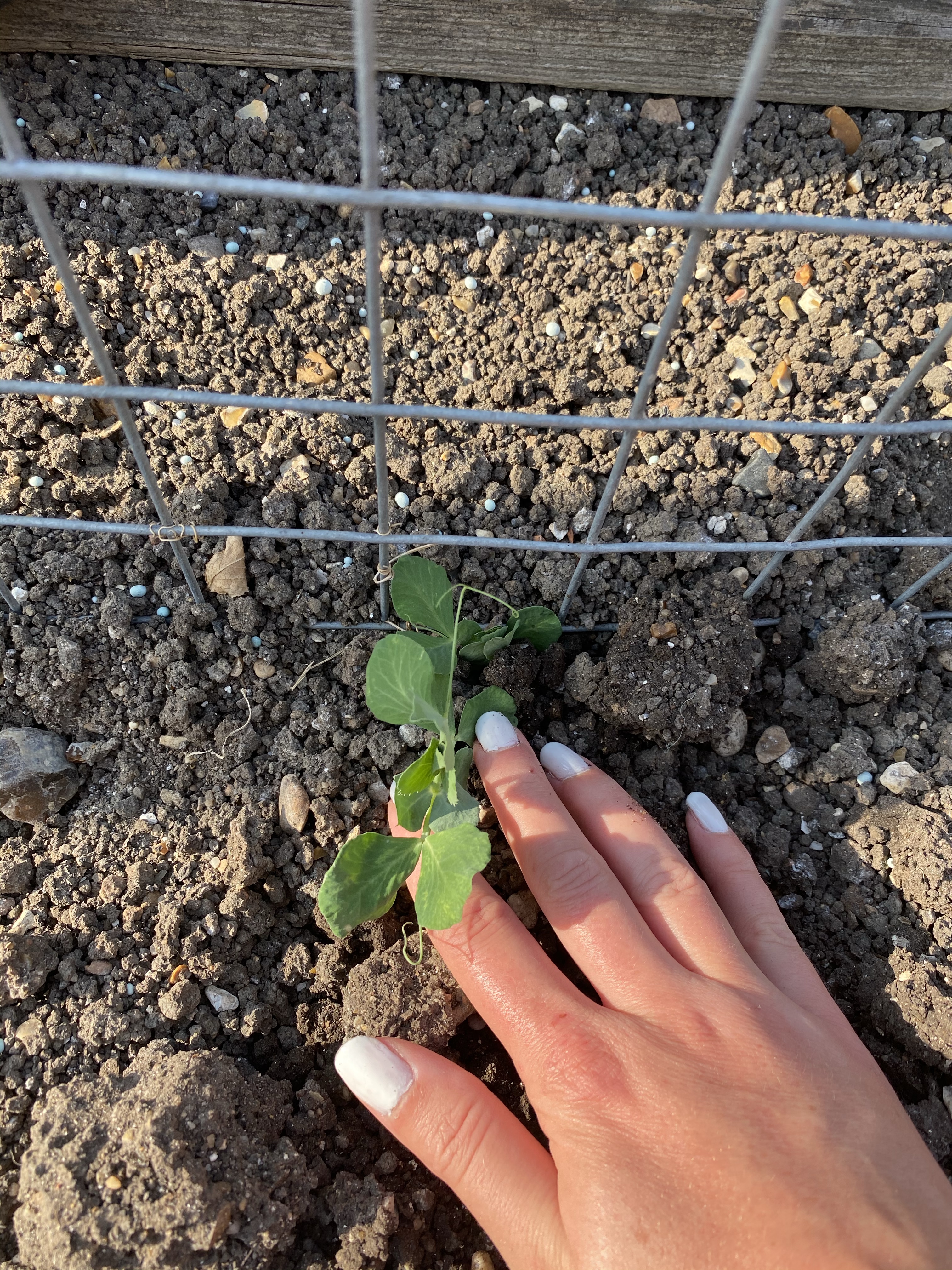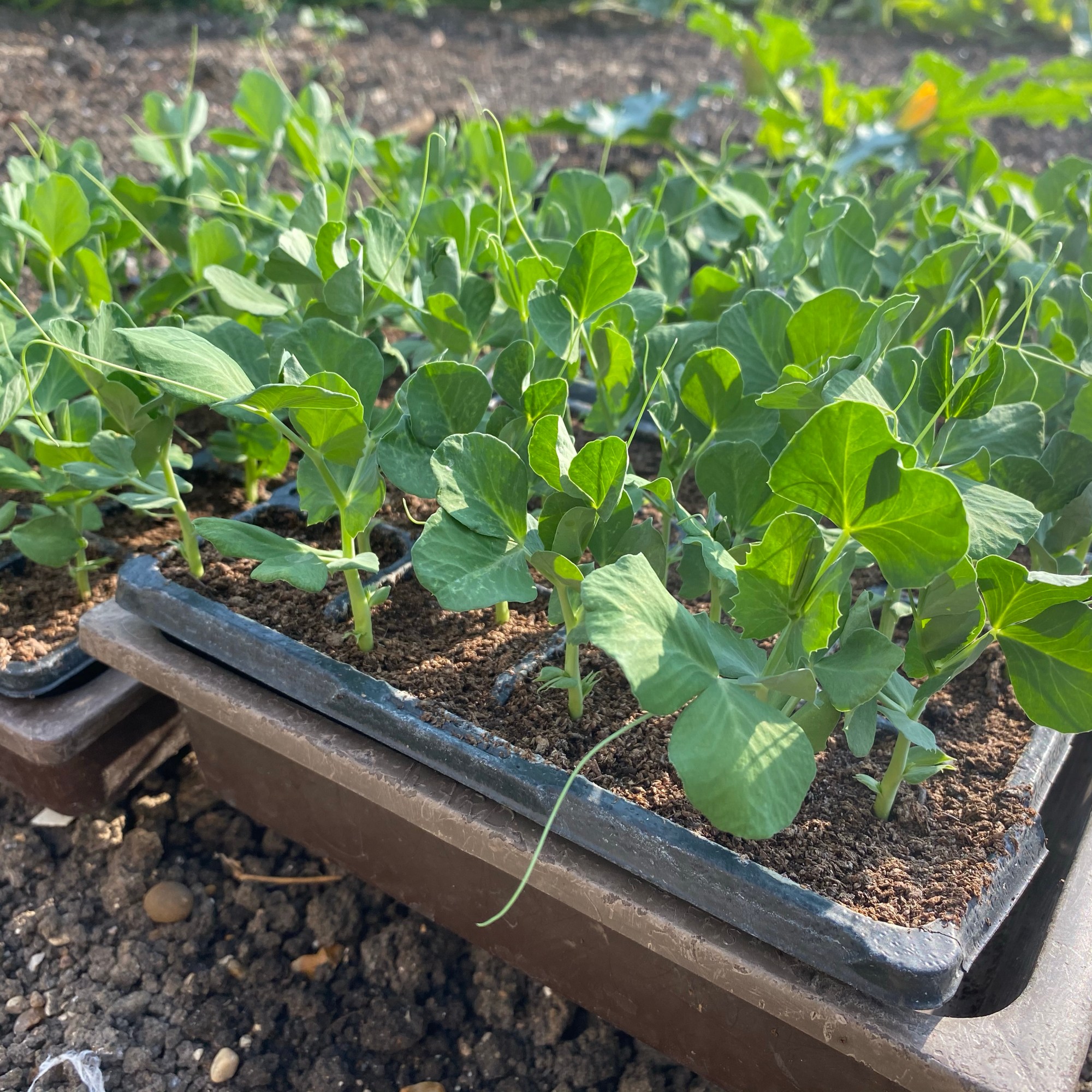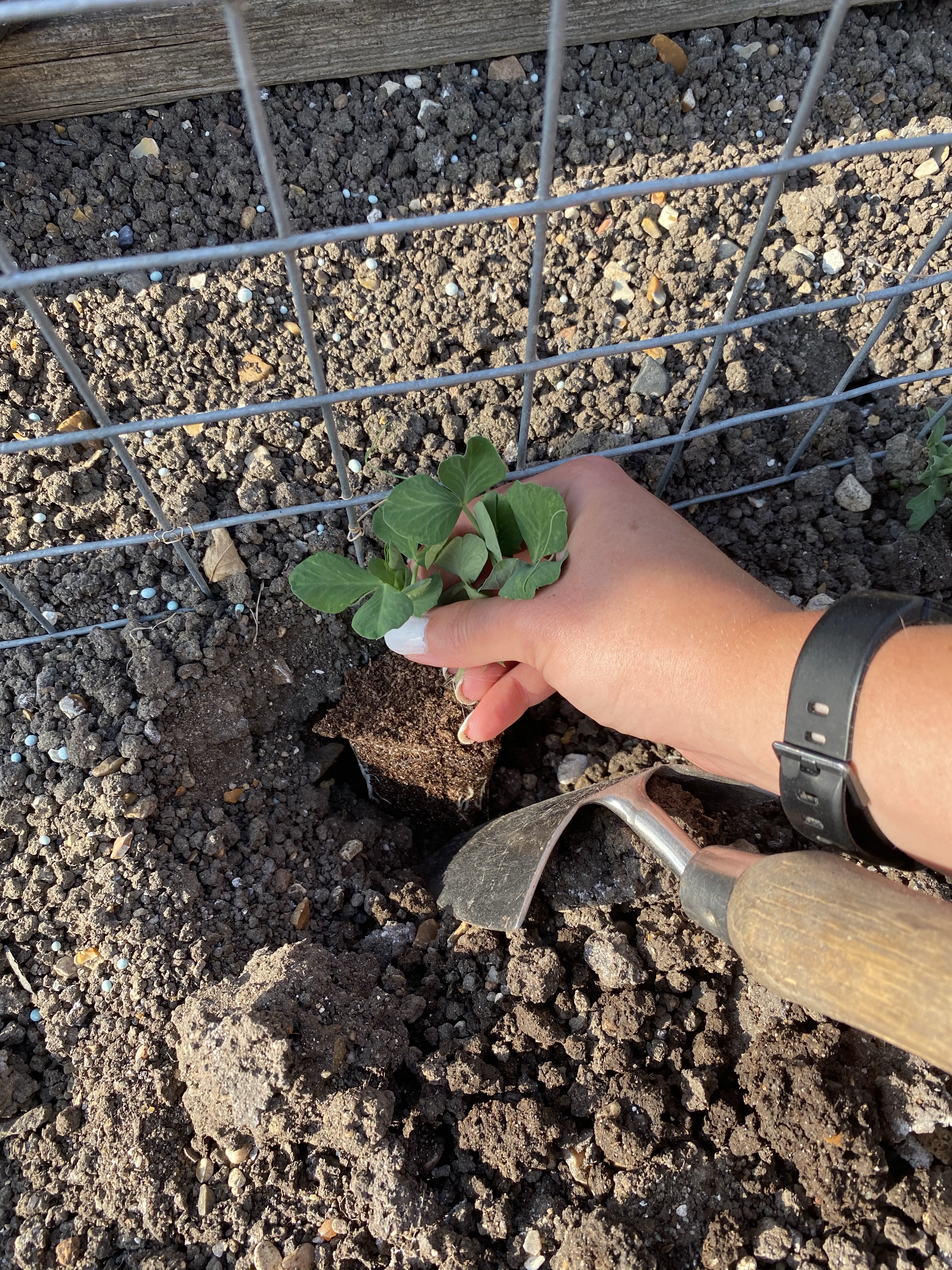 Then we carefully took each pea plant out of the cell tray, popped it into the ground and then gently firmed soil back round the plant to settle the soil around its roots.