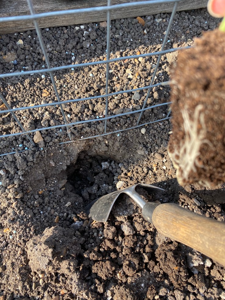 As you can see, the plants had put out quite a lot of roots already! We dug a shallow hole for each cell tray with a trowel, and then popped one cell into each hole.