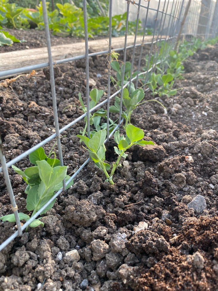 Before we started planting, we’d sprinkled some general fertiliser over the soil so that this would get trowelled into the ground as we were planting, giving the newly planted peas a little boost to get them going.