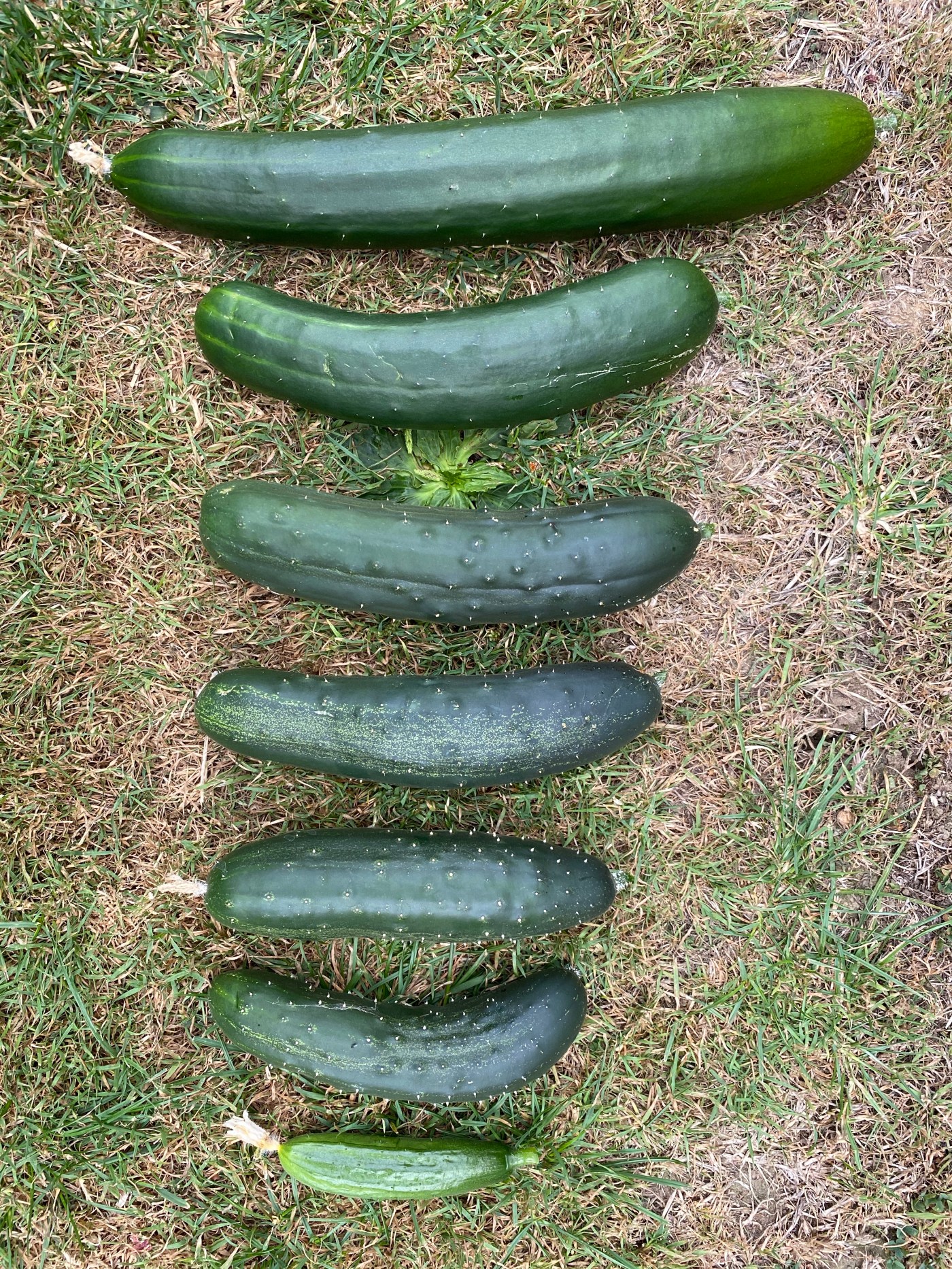 And this is the cucumber harvest the other weekend. This is a mixture of Diva, Marketmore and Tasty King from the plants we have growing outside. I lined them up in height order. It reminded me of school photos – I was always the shortest one, like the Diva right at the bottom of this photo!