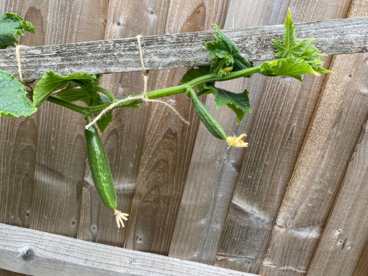 The outdoor cucumbers are still absolutely loving life up against the fence. To be fair, they have got one of the best spots in the garden: protected from the wind, and in the sun for the longest part of the day as any part of the garden!