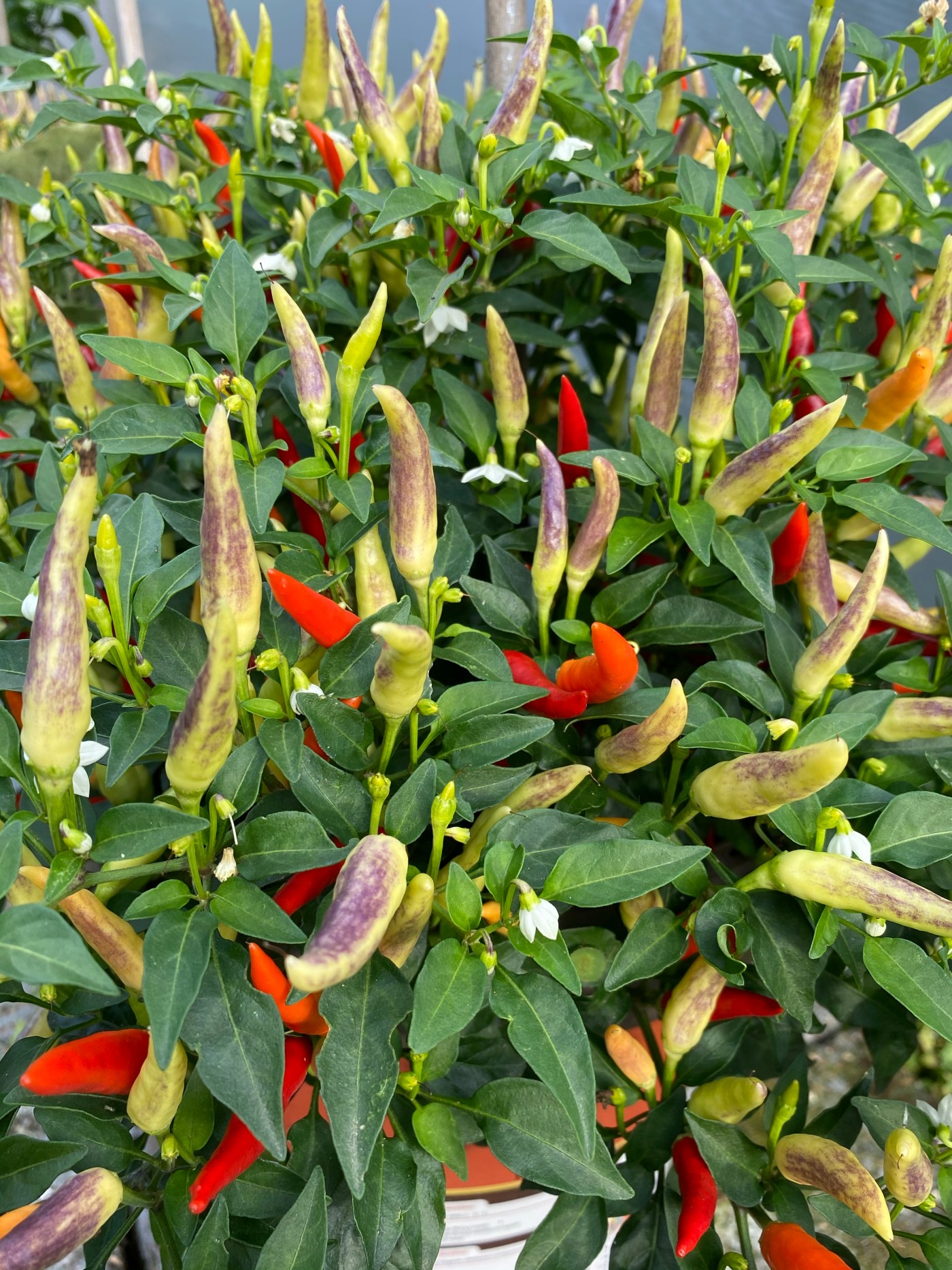 In fact, they are so colourful, we are thinking about having them in containers at either side of our front door next year! They are colourful the whole growing season – green foliage to begin with, then yellow chillies all over, and now the various colours as they start to ripen.