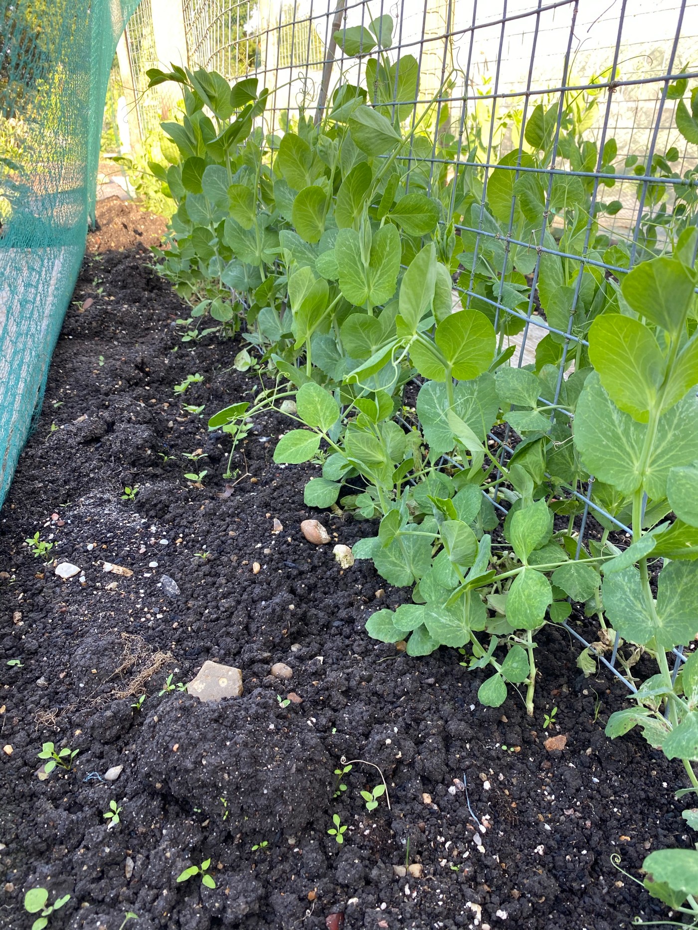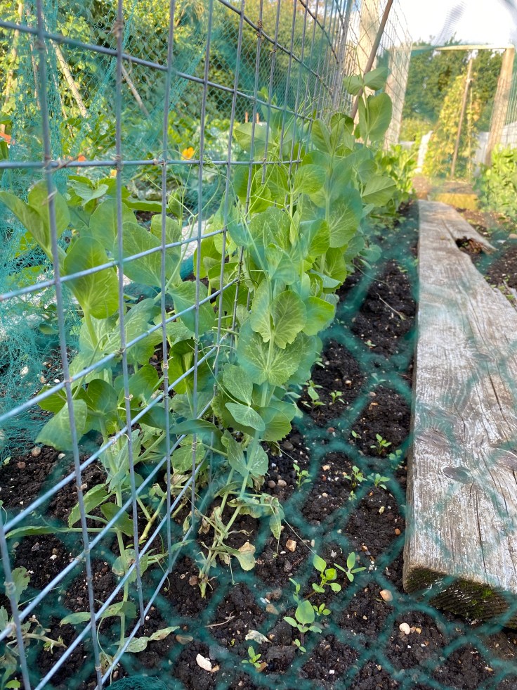 Before they got too entangled, we carefully eased the netting away and held this down further away from the plants. We then tried to persuade the pea plants to use the wire mesh as a climbing frame going forward!
