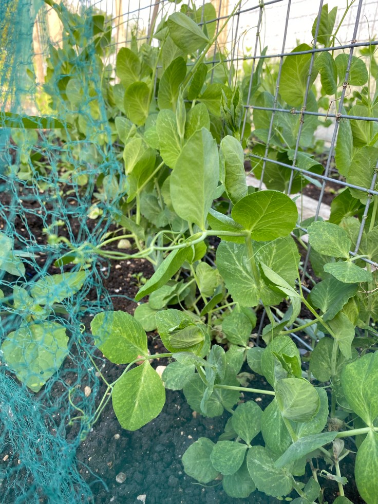 This is a photo from a couple of weeks ago. As you can see, the plants seem to be growing strong, but have a tendency to lean towards the bird netting we’ve thrown over to deter the pigeons, rather than climbing up the wire mesh we’ve provided for them to climb up!