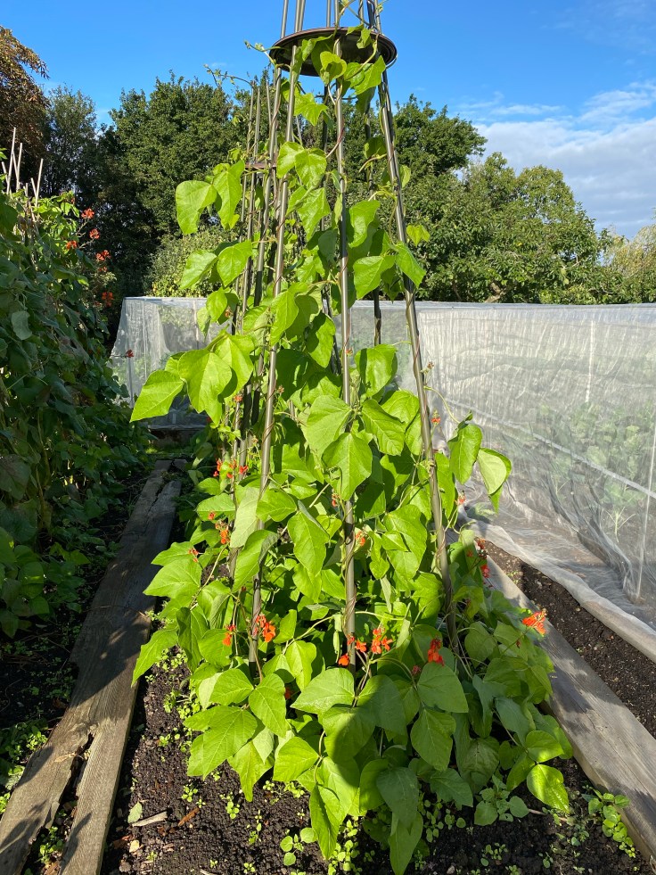 We love runner beans, but our earlier sowings are starting to stop producing beans now. So we tried a late sowing and are growing these up a wig wam.