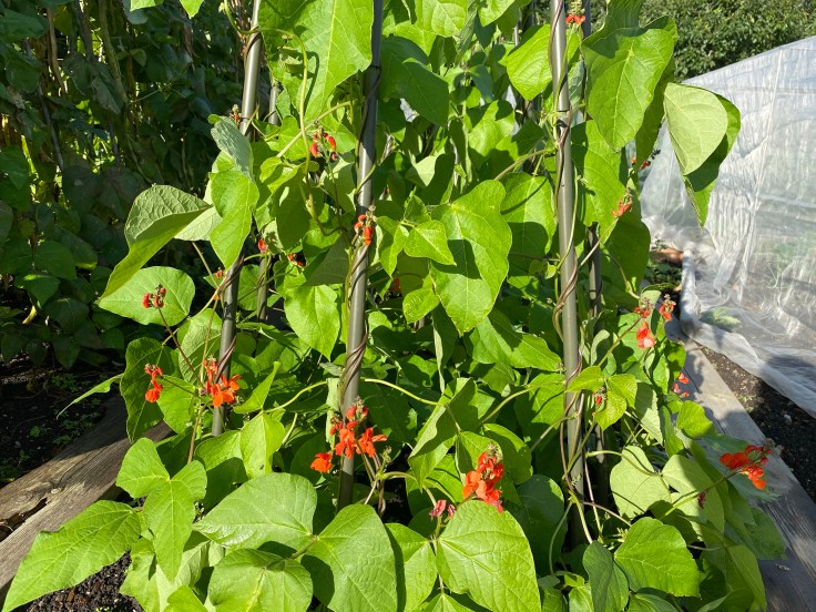 In these photos, they had got to the top of their canes and were just starting to flower. When they get to the top of their canes, we pinch the growing point out to encourage the production of beans, rather than more vine!