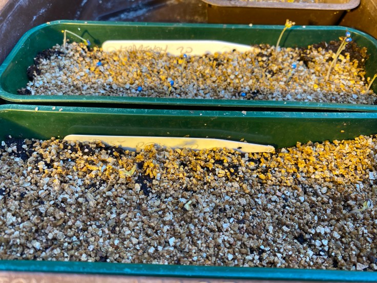 These were sown a couple of weeks ago in the usual way. The seeds were sown in quarter seed trays in slightly moistened Seed and Modular compost, gently pushing the seeds into the top of the compost before covering with vermiculite to exclude the light.