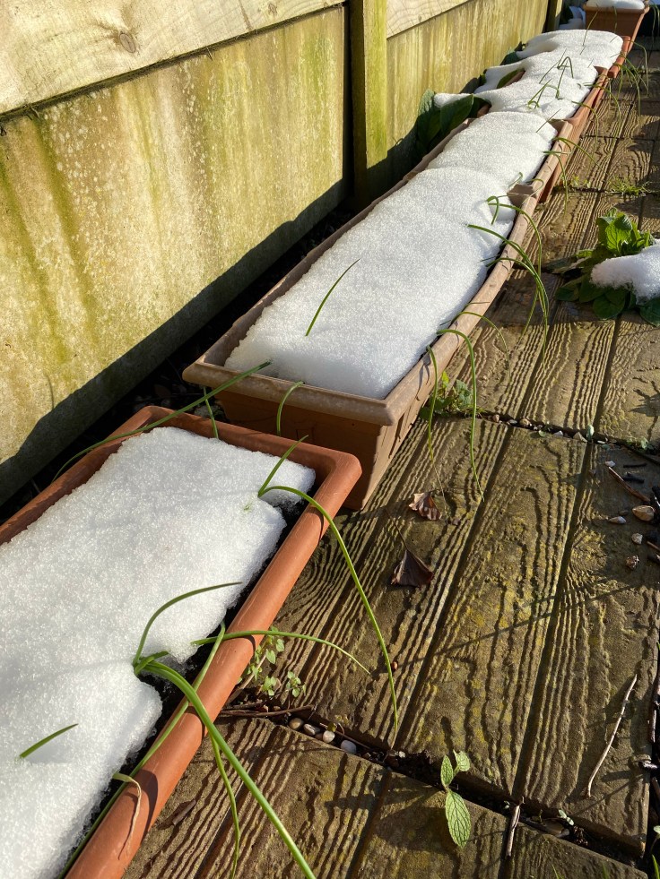 Although the onions we had planted are hardy, we’re not sure they enjoyed their week under snow all that much. Luckily, the snow has melted now, and they are gradually up righting themselves after a week of being squashed by the frozen snow. As you can see, when the weather is right, they’ve got quite a nice little sunny spot where we have them located. So fingers crossed for a good crop later in the summer.
