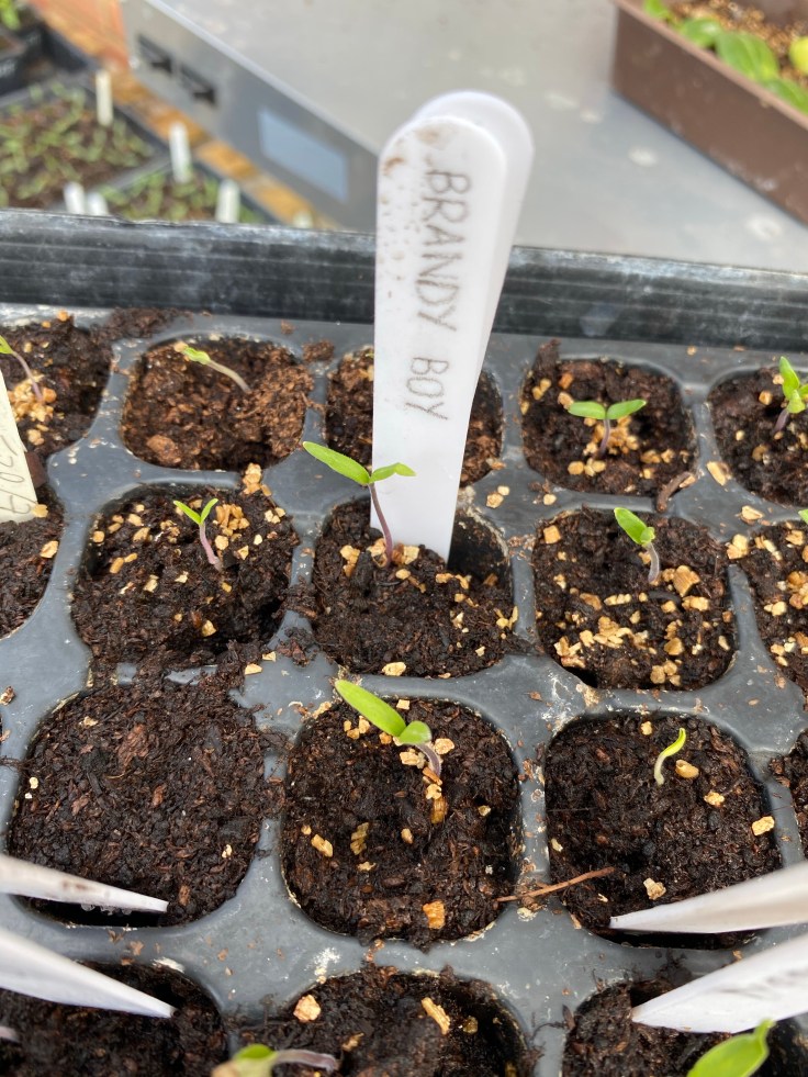 Most of the tomatoes have germinated in less than a week and have needed to be pricked out. These are pricked out into 60-cell cell trays in Seed & Modular compost. Again, they are carefully labelled so we don’t get all the varieties confused!