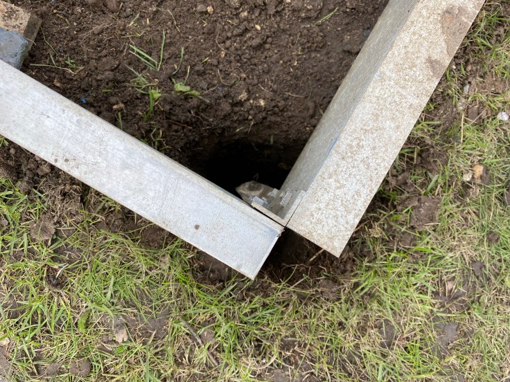Next, we needed to concrete the posts in to keep the base in place once it has the greenhouse on top of it. First, we dug a hole around each leg/post that we would fill with concrete once ready.