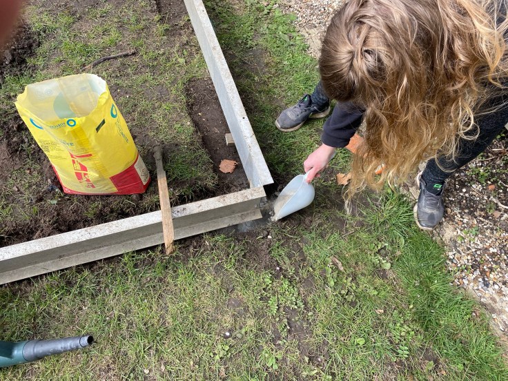 Next up, we filled each hole with concrete. We used fast drying post crete for ease, as you don’t have to pre-mix this before putting it in the hole, so there’s less mess!