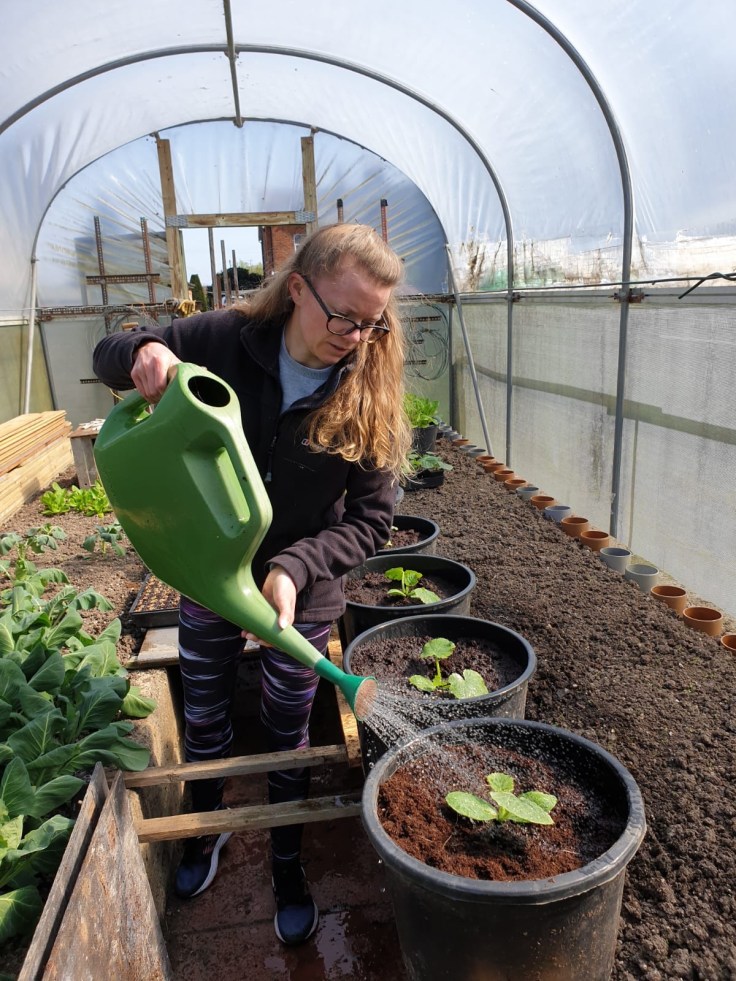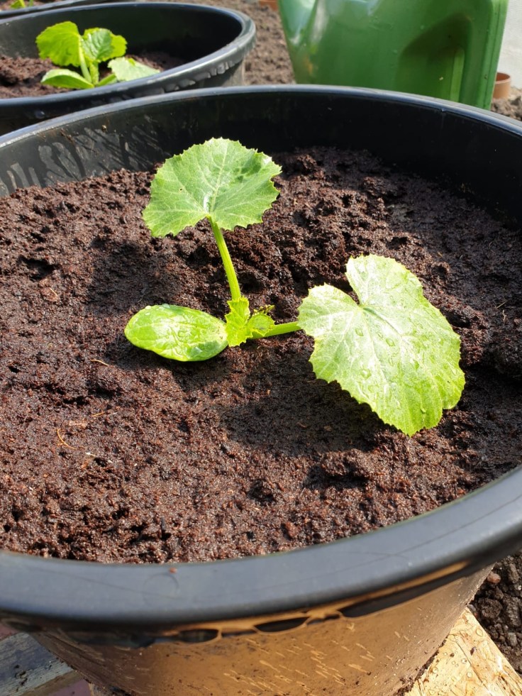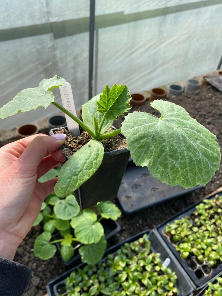 Our early sowing of Midnight courgettes were ready to plant out into their pots last weekend. As our greenhouse is still not fully erected, they are staying at my parent’s house in the polytunnel to protect them from the colder weather. Which is lucky, as we’ve had some cold nights this week!
