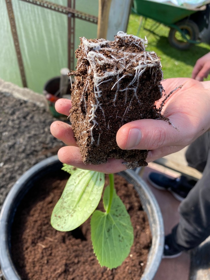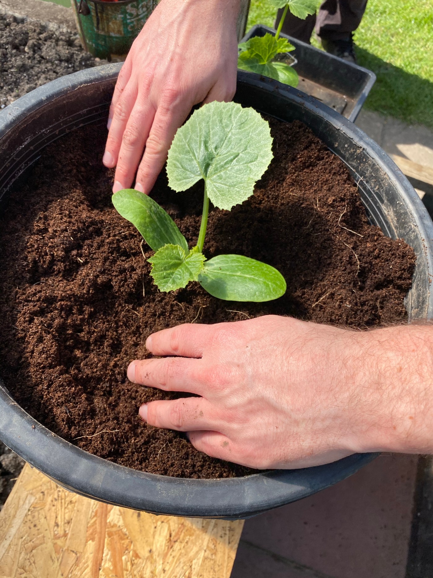 We then planted one courgette per pot, and gently watered them in to settle the compost in around the plants. As you can see from the photo, they had a good root structure in their existing pots, and were definitely ready to move on to their larger ones