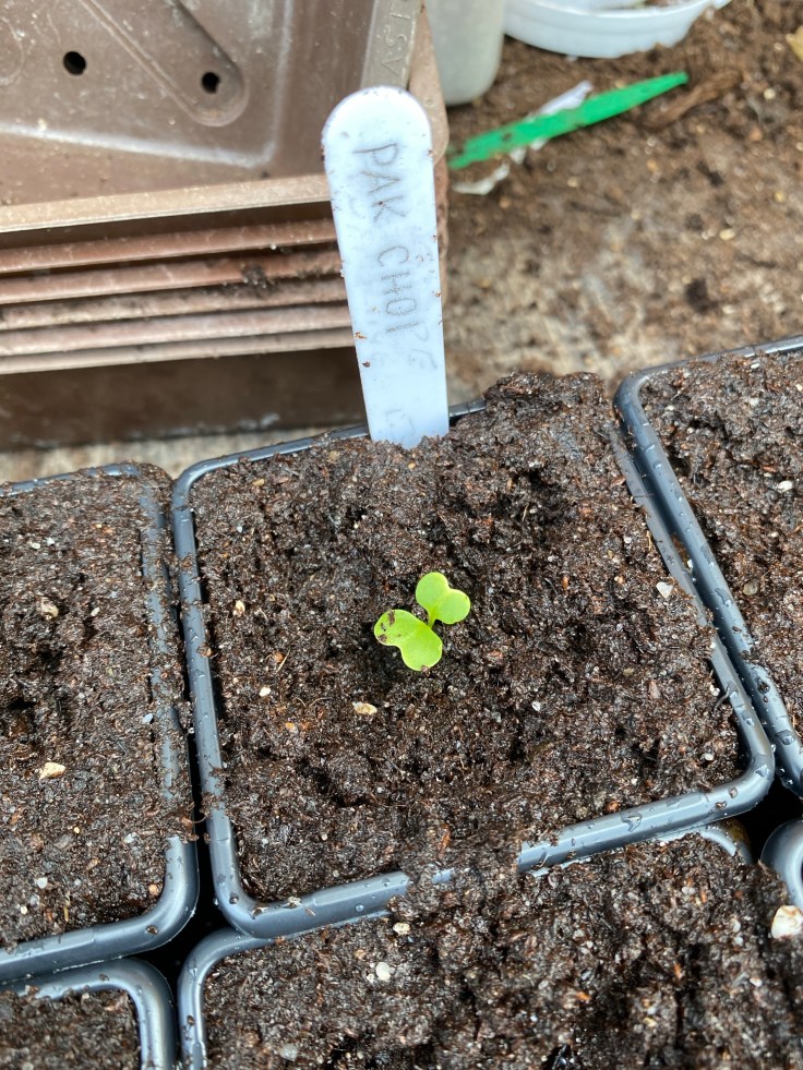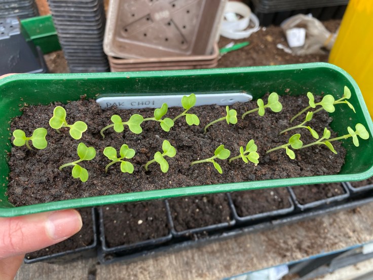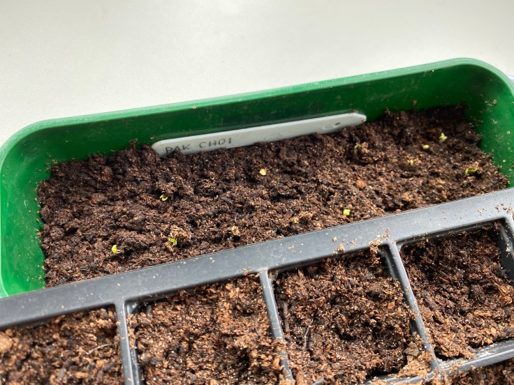 After sowing the pak choi seeds a week or so ago, they were ready to prick out. They started poking through (as you can see from the photo) after just a couple of days.