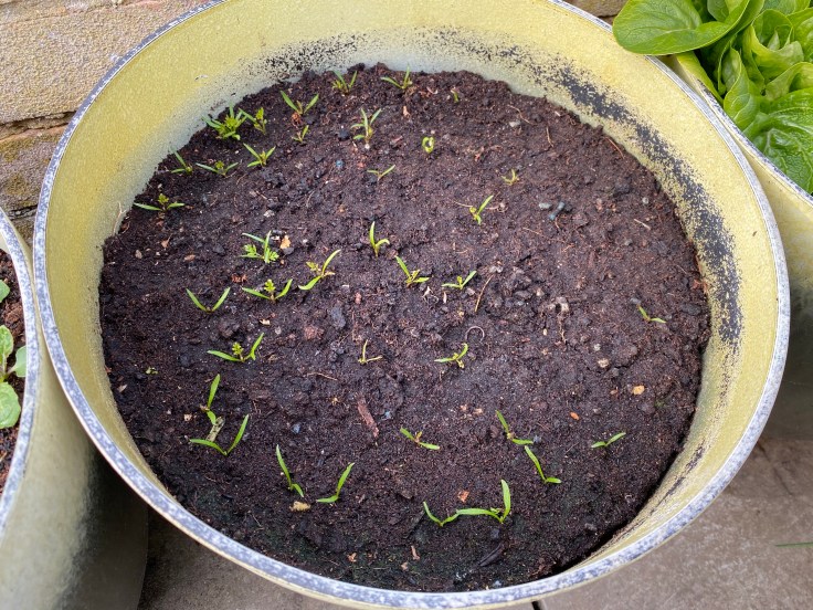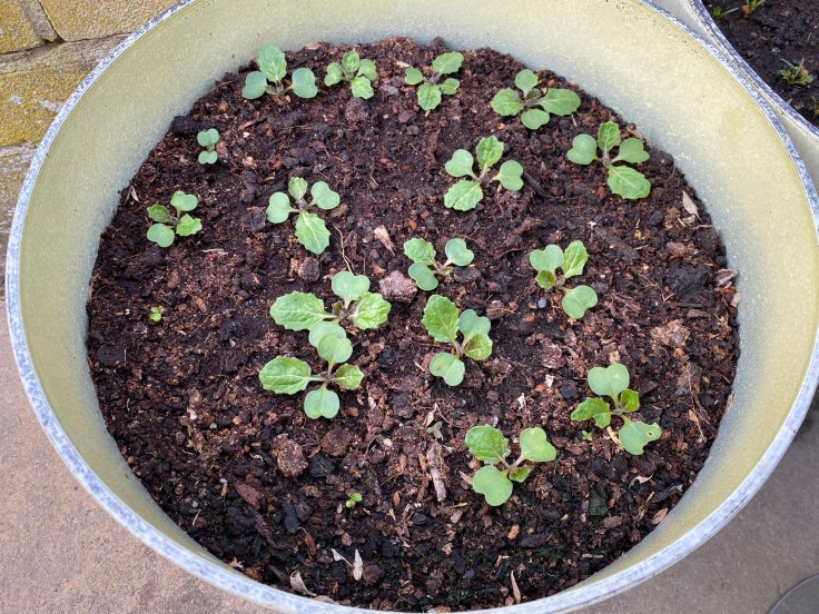 Then we’ve got the Falco turnips and Paris Market Atlas carrots. Turnips are relatively fast growing compared to carrots, as you can see. However, they’re both progressing nicely and just need a bit of water every couple of days to stop the compost drying out.