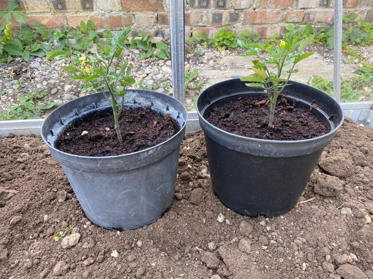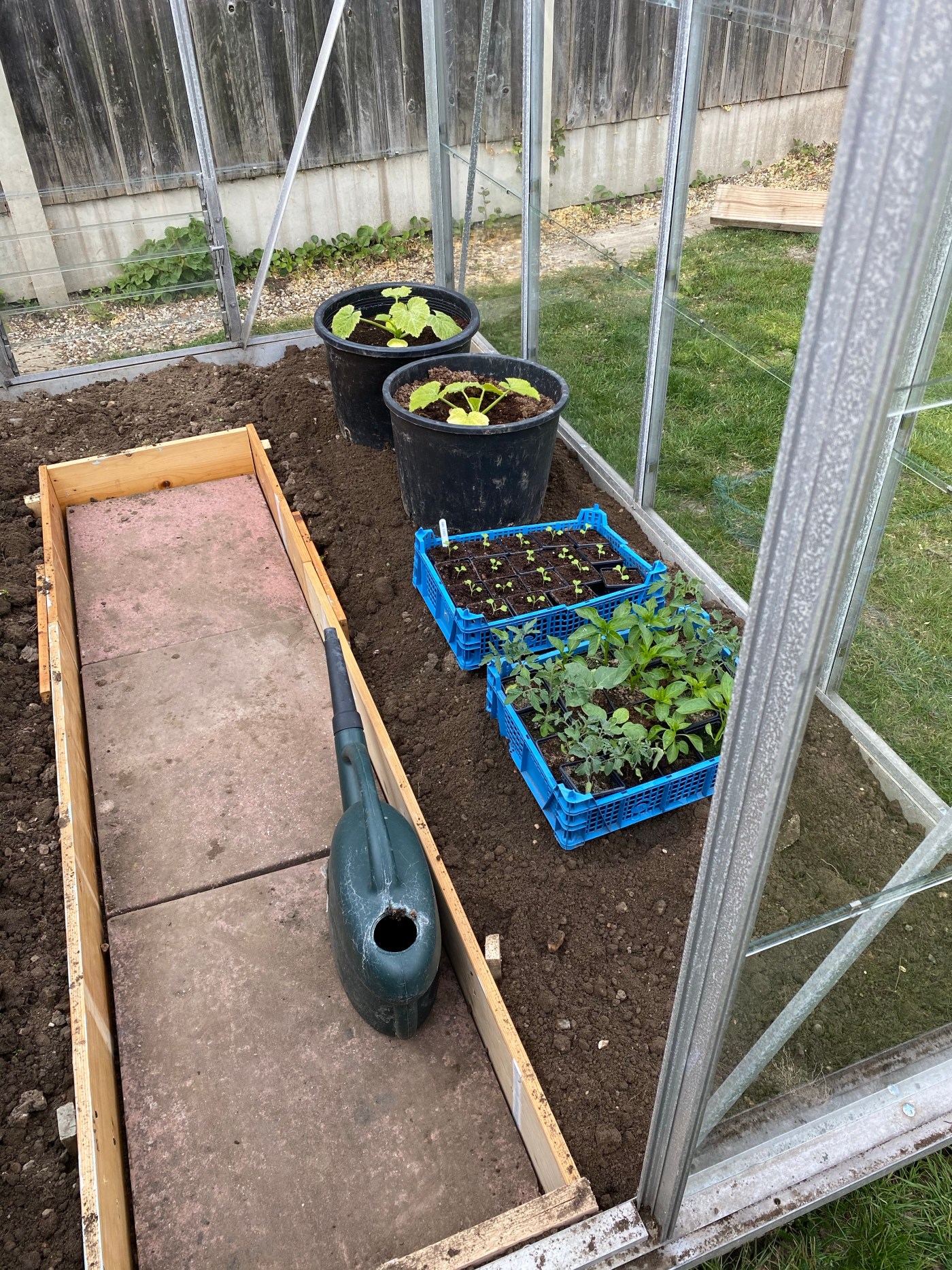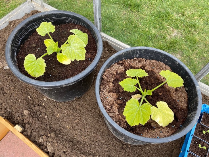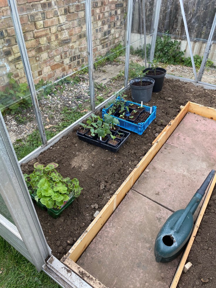 We’ve got quite a few crops in the greenhouse now. We’ve for the Midnight courgettes that we planted out in their pots the other week and kept in Dad’s polytunnel until the greenhouse was up and running. The Mimi tomatoes are also happy enough in their new pots and have almost doubled in size in a week!