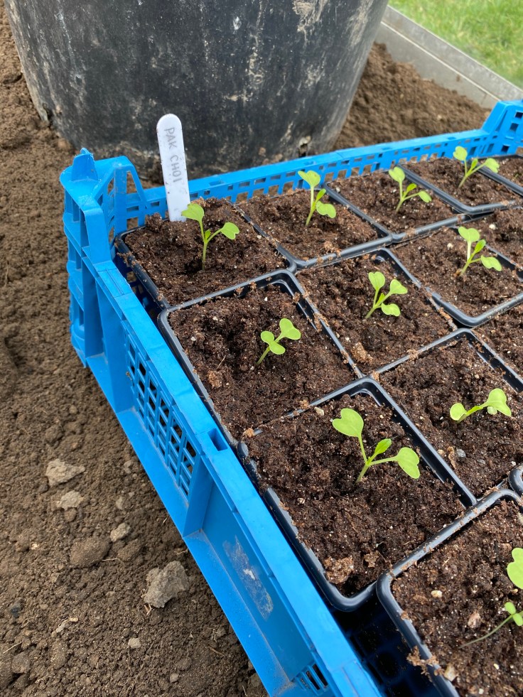 Last but not least are some of our smaller seedlings. First up is the pak choi which we pricked out the other week and have been keeping in our porch whilst we finished the greenhouse off. However, we’ve now moved the seedlings out into the greenhouse to grow on.