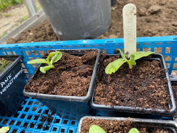 Then we have the sunflowers which we potted up into 3″ pots at the weekend.