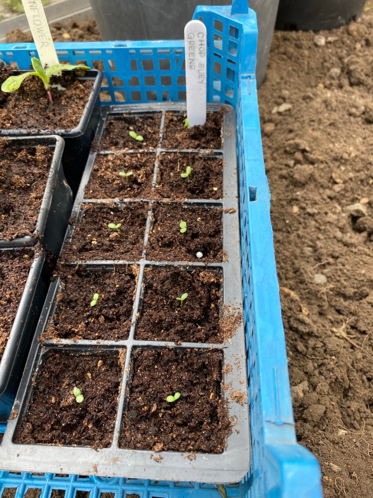 Last but not least, there’s the chop suey greens which we pricked out into cell trays at the weekend too after they germinated within a week of sowing.