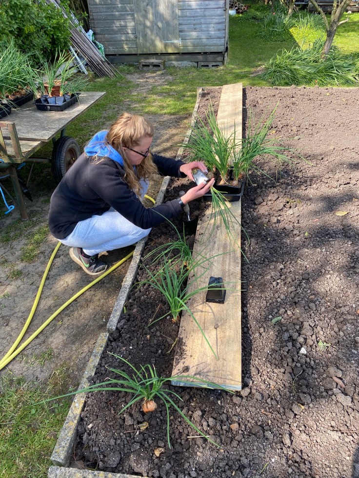 After planting them out, we watered them in to settle the soil around the shallots. Hopefully they’ll be happy with their new home!