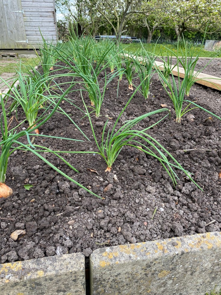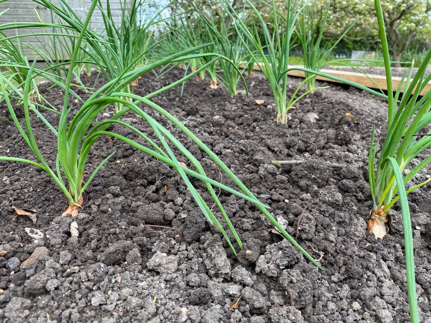 The shallots have been growing excellently in their pots we planted them out in a couple of months ago. However, they were starting to outgrow them.