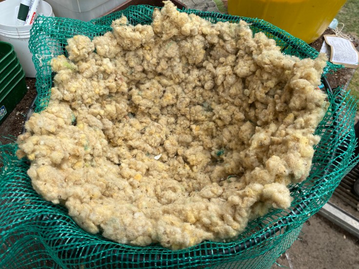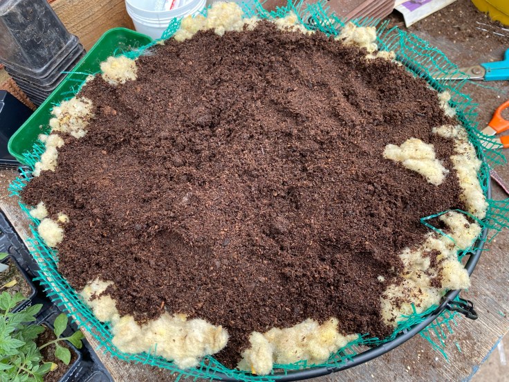 We’re trying something new for our hanging baskets this year. We have lined the hanging baskets with sheep’s wool. We bought a bag of this from a company called WOOL SHrED who came and gave us a talk at the Southern Branch AGM a couple of year’s ago. They are based in Horsham, Surrey. The sheep’s wool is supposed to act as a great liner as it aids water retention whilst using a by-product that would otherwise go to waste.