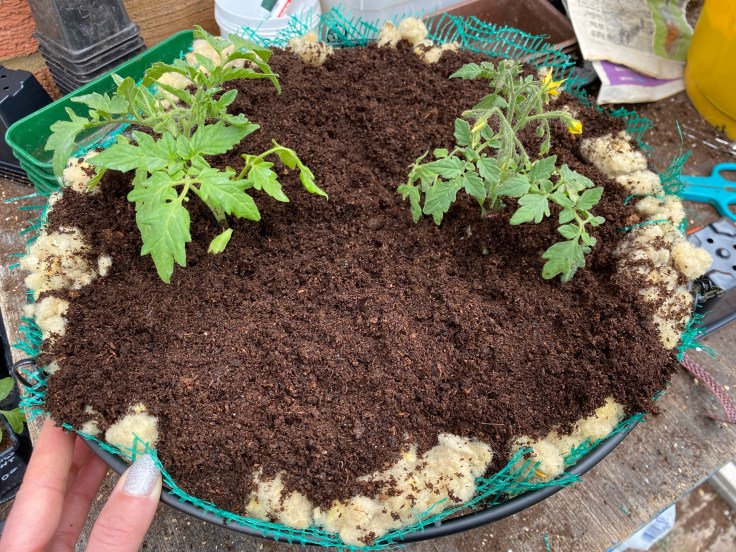 Next, we trimmed the string bag around the top of the hanging basket and filled it with compost, before planting the tomatoes in, two plants per basket.