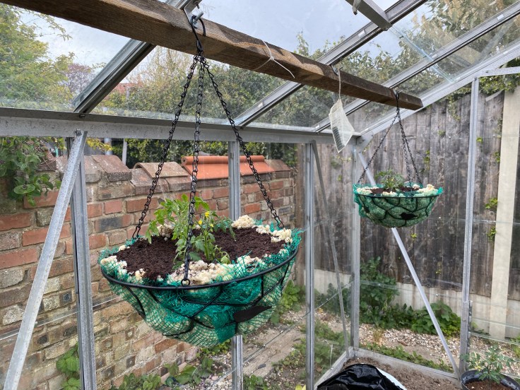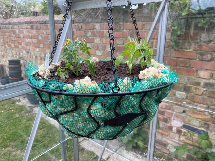 We wanted to try some tomatoes in hanging baskets this year. We’ve got to get a couple of brackets to fix them on to the house, but for now, we were going to grow them on in our greenhouse anyway, so that can wait another couple of weeks!