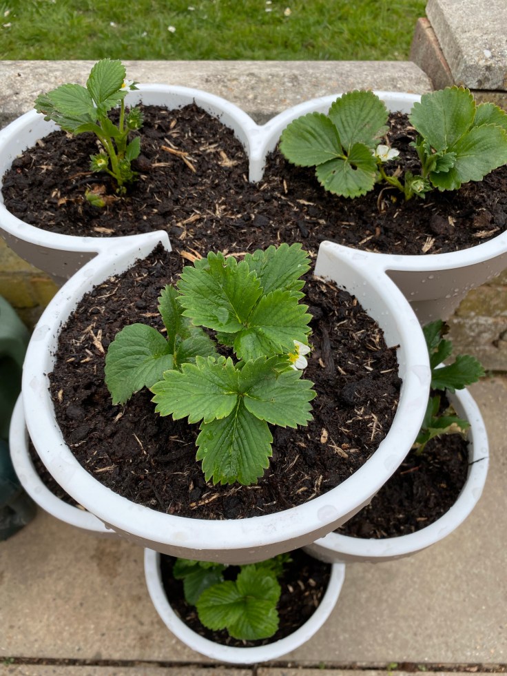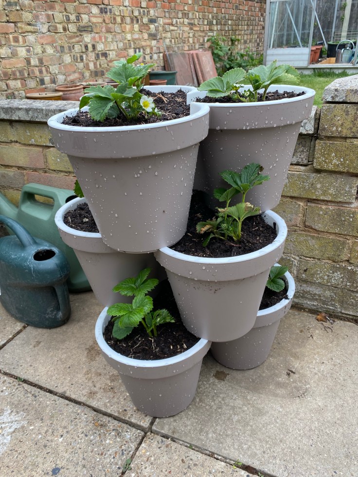 We’re also giving strawberries a go. We have a container that we were gifted which is a set of three tier pots. We think these would be great to have strawberries trailing out of.