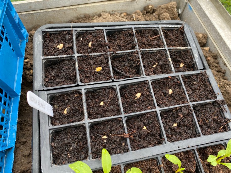 Next up are the soya beans which are less successful. We’re not sure if we’re doing something wrong, or whether we just got a dodgy batch of seeds! There was only one seed out of 20 that germinated out of the first batch, and it looks like it won’t be much different for the second sowing! Anyone with any experience of growing them – we’d be keen to hear from you!