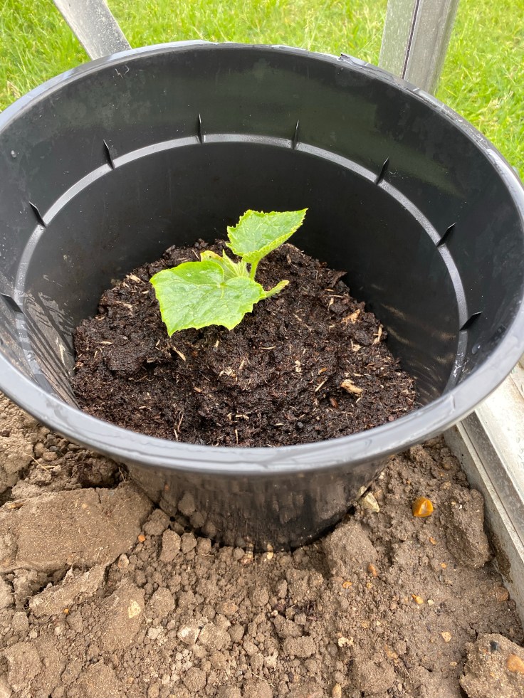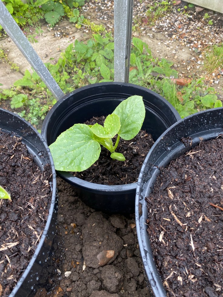 Cucumbers can be funny things, and they don’t really like too much moisture around their stems. Therefore, we planted them out in multipurpose compost and then heaped a little compost up round the stem to create a small mound. We then try and water the plants around the moat round the edge, rather than over the leaves or too close to the stem. There’s no guarantee it’ll work as they can still be quite temperamental, but we’ve got to try!