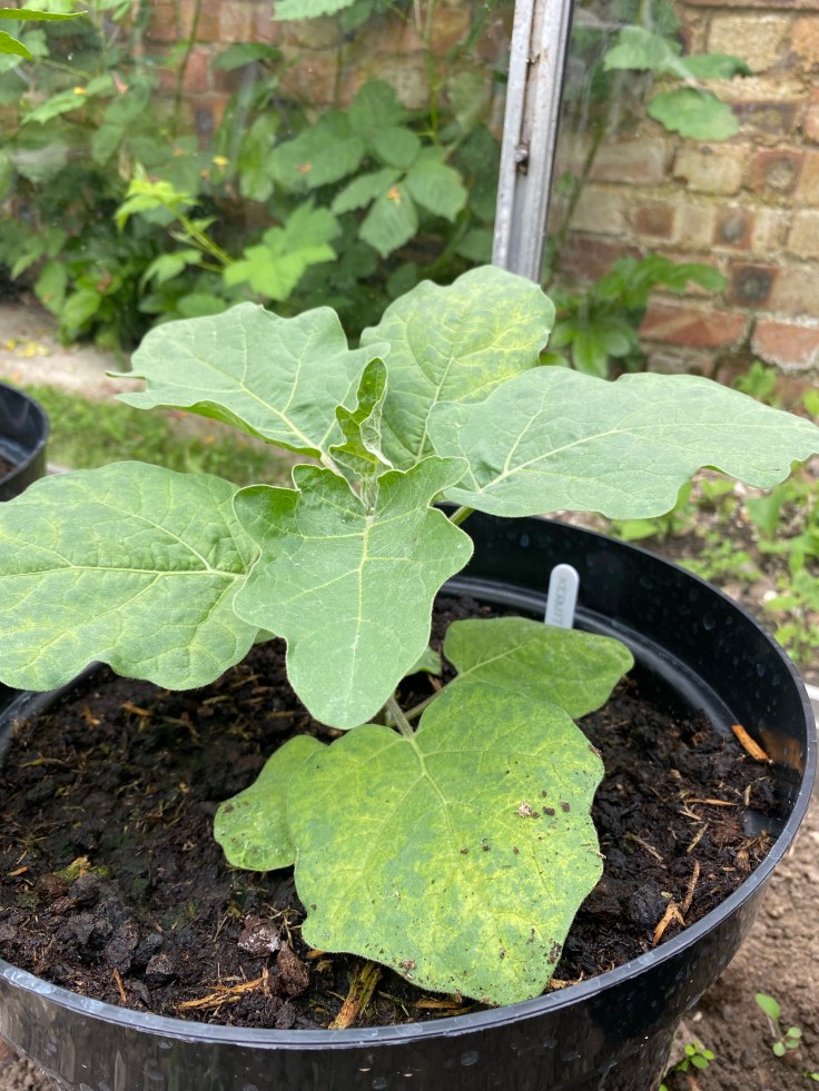 Our Kermit and Baby Bell aubergines are growing away nicely in their 10 litre pots in the greenhouse. It’s surprising how much they’ve grown in the short time since they’ve been potted up. As with our other container crops, we’re watering these morning and night, including a high nitrogen liquid feed every couple of days.