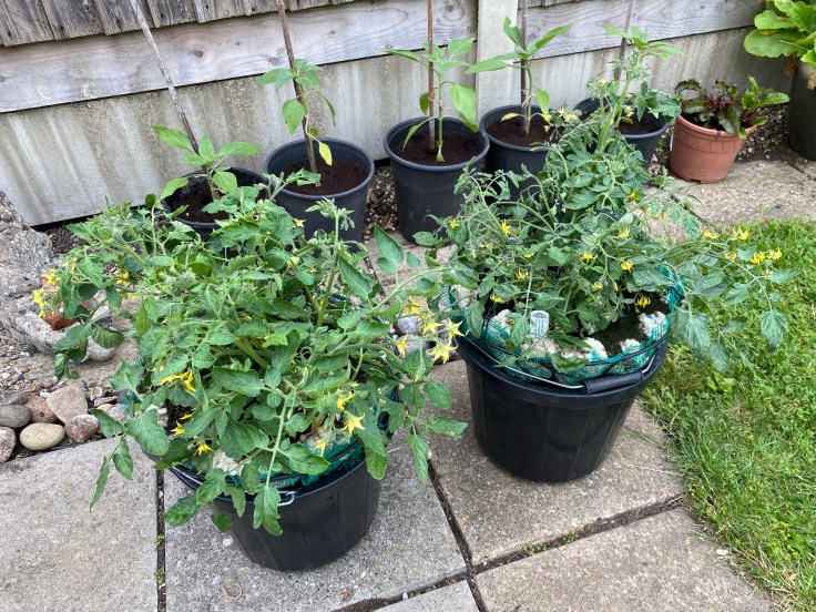 Last but not least we’ve got the hanging basket tomatoes. These are growing away nicely and the sheep’s wool seems to be keeping the moisture in the hanging baskets – so far, so good! We have now moved them outside to harden off though. They are currently sat on buckets whilst they acclimatise and we can always take them back in the greenhouse if the weather turns cooler.