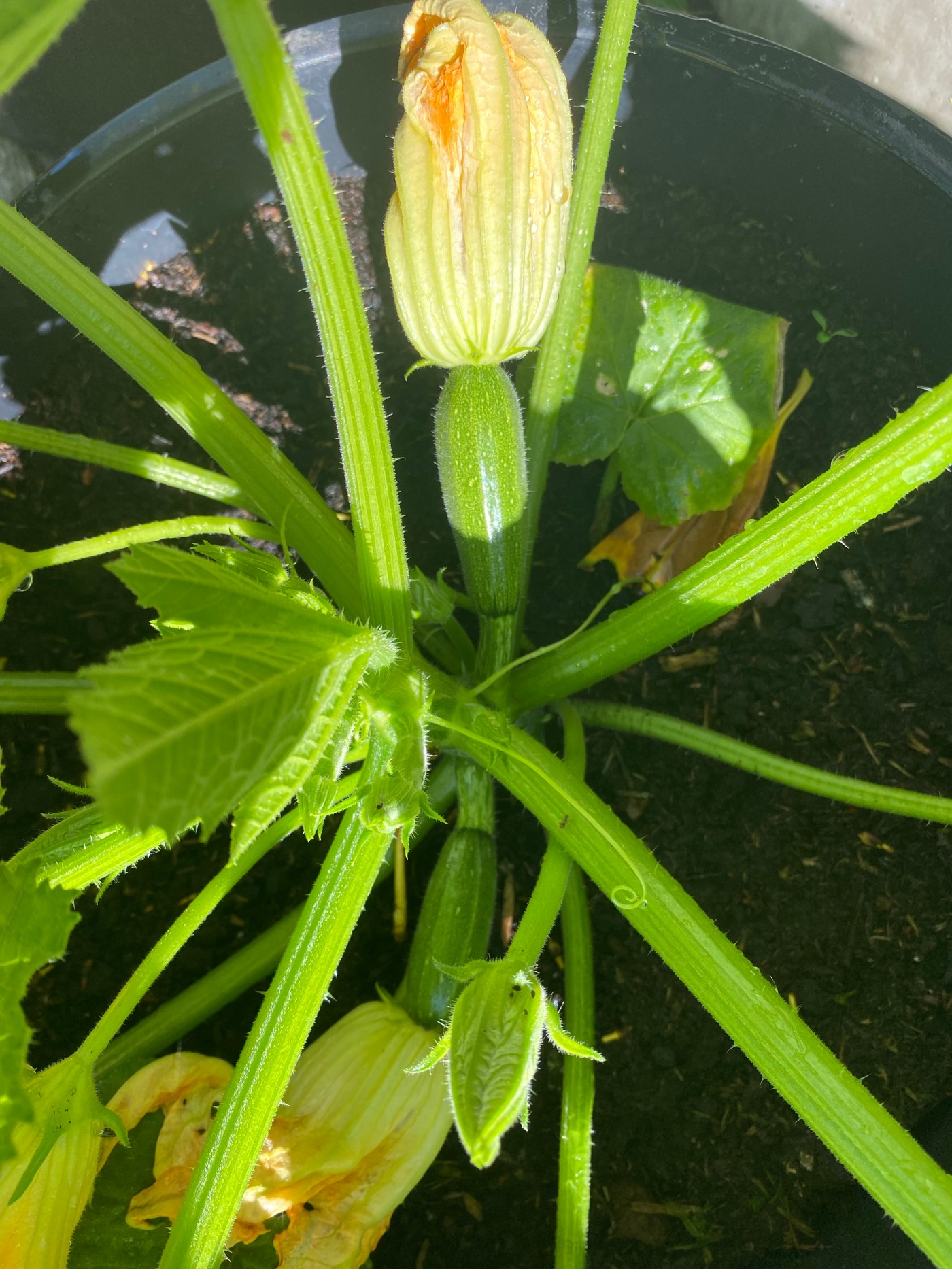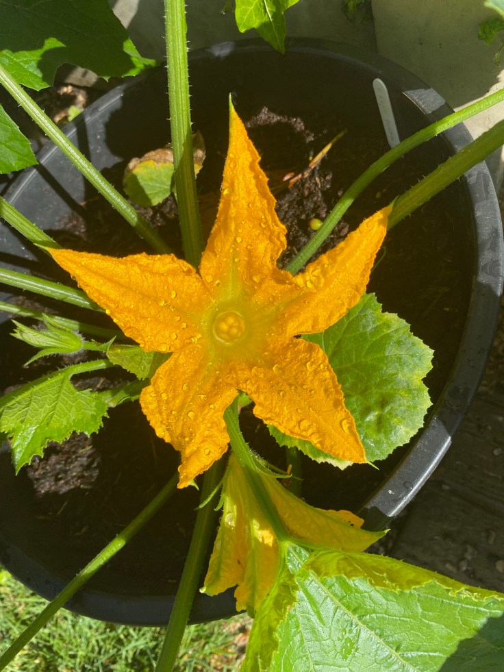 The courgettes are certainly enjoying the hot weather we’ve been having. Well, providing they are kept adequately watered that is. They drink a lot of water on hot days, especially when they’re grown in containers, so we’re giving our water day and night at the moment.