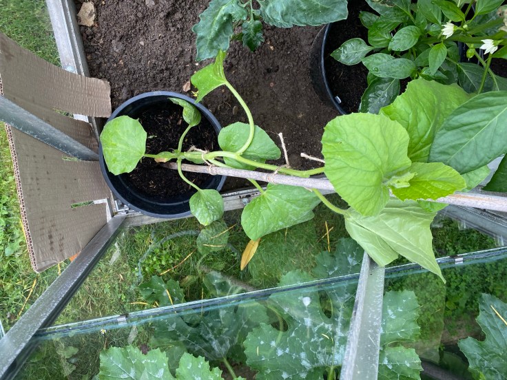 The Striped Armenian cucumber which was initially struggling in its new home has also really got going now. Unfortunately there haven’t been any fruits set yet, but the plant is looking strong and healthy so we’ll do out best to be patient on that front.
