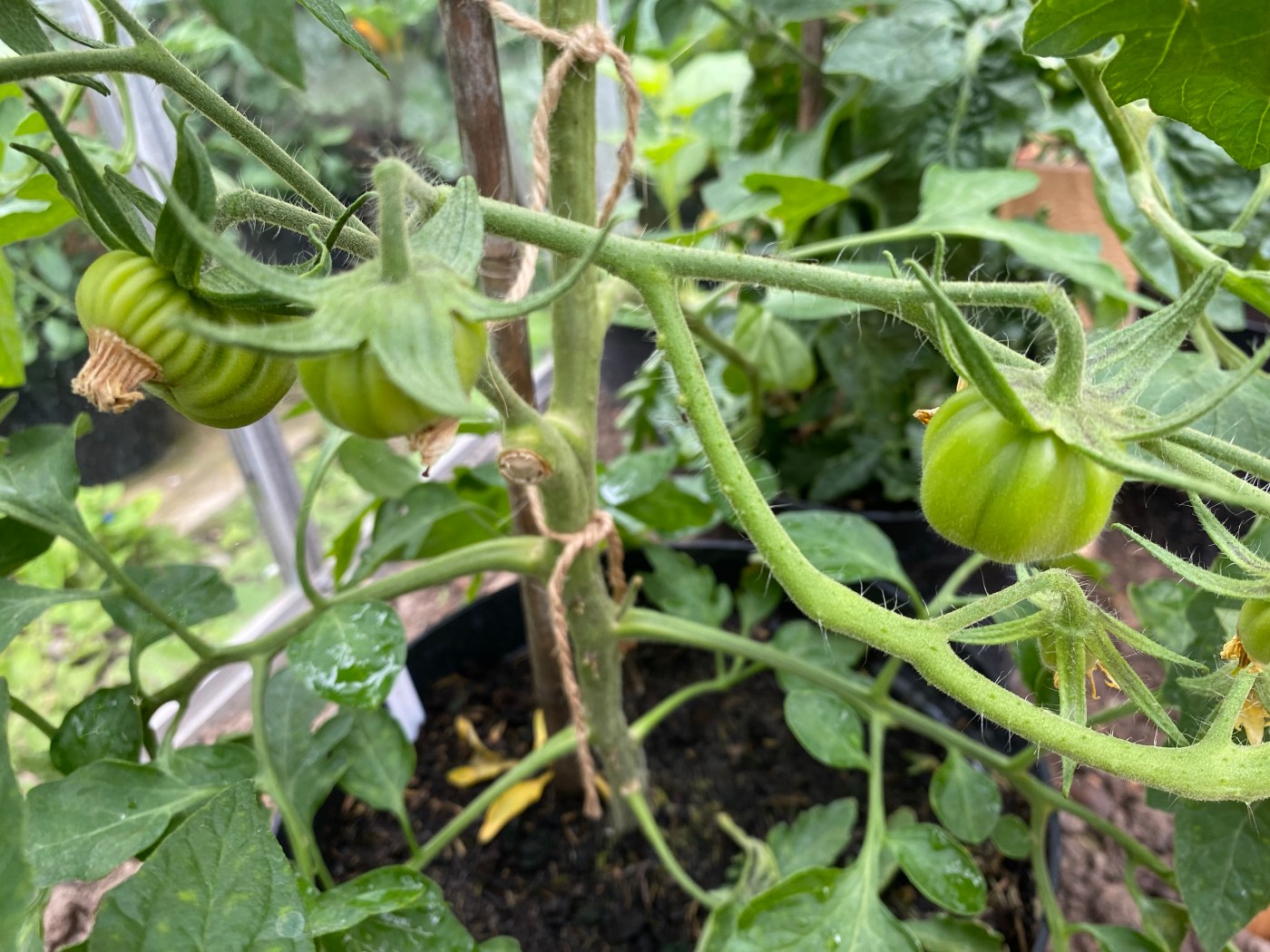 In the meantime, we’ll keep them fed and watered. As they’ve now started setting fruit, we have switched from a high nitrogen to high potash liquid feed a couple of times a week. We’re also making sure they’re tied up to their canes for support and that any side shoots are pinched out.