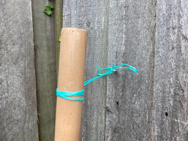 We’ve then started to tie each plant up the stake every couple of inches. There’s a fine balance to be struck when doing this, between getting the plant tied up as close to the stake as possible to start training it vertically, but without snapping it off or beheading it! We find that it’s much easier as a two-person job, with one holding the courgette plant to support it and the other tying the string round the stake and the courgette stalk.