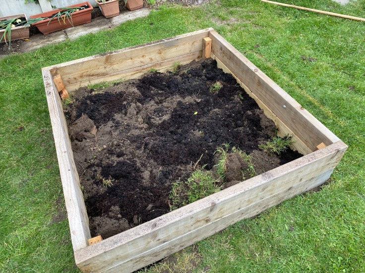 We now have a little raised bed, courtesy of Dad’s handy work with some spare pieces of timber.